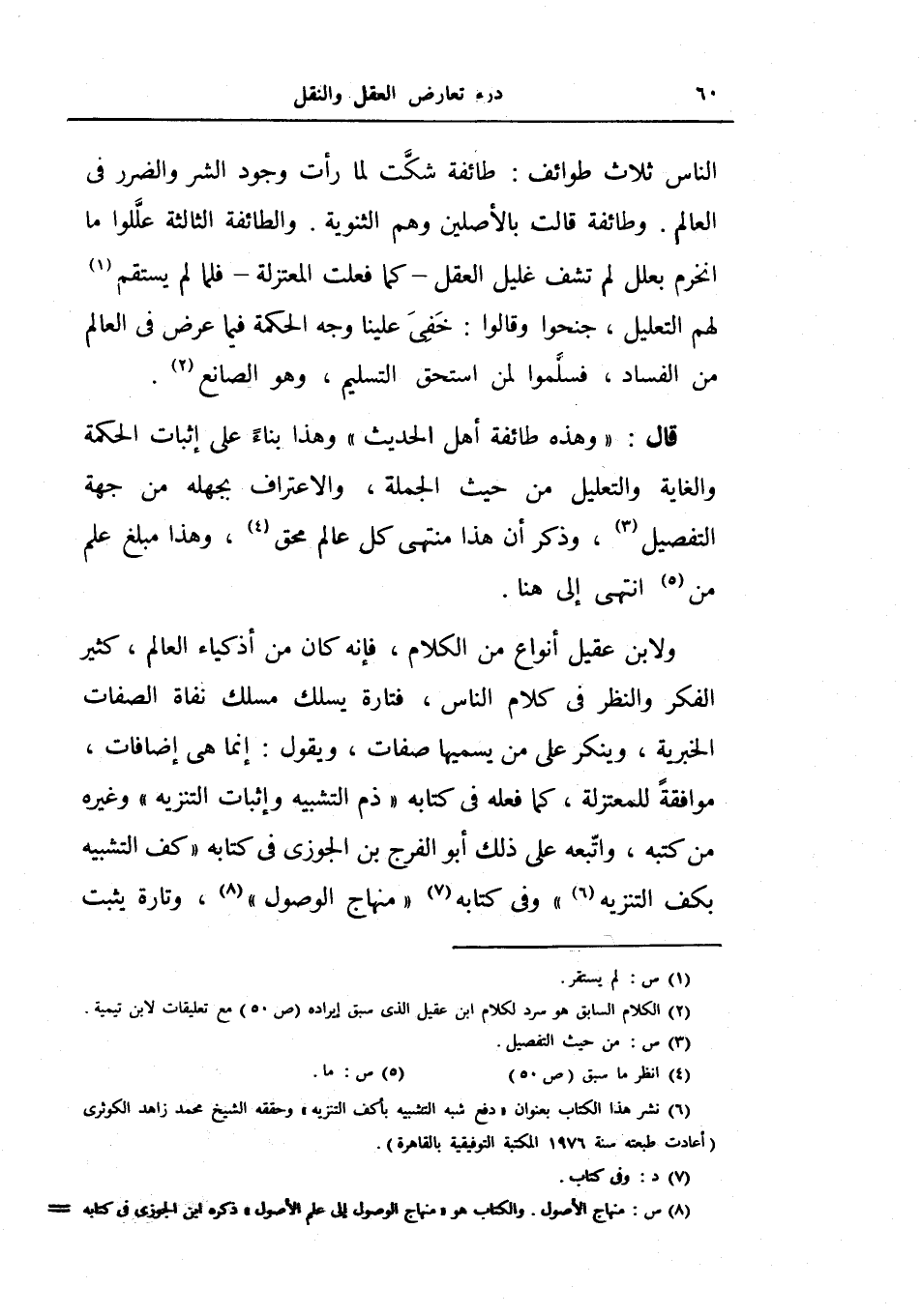 ولابن عقيل أنواع من الكلام، فإنه كان من أذكياء العالم، كثير الفكر والنظر في كلام الناس، فتارة يسلك مسلك نفاة الصفات الخبرية، وينكر على من يسميها صفات، ويقول: إنما هي إضافات، موافقة للمعتزلة، كما فعله في كتابه ذم التشبيه وإثبات التنزيه وغيره من كتبه، واتبعه على ذلك أبو الفرج بن الجوزي في كتابه كف التشبيه بكف التنزيه) في كتابه منهاج الوصول، وتارة يثبت