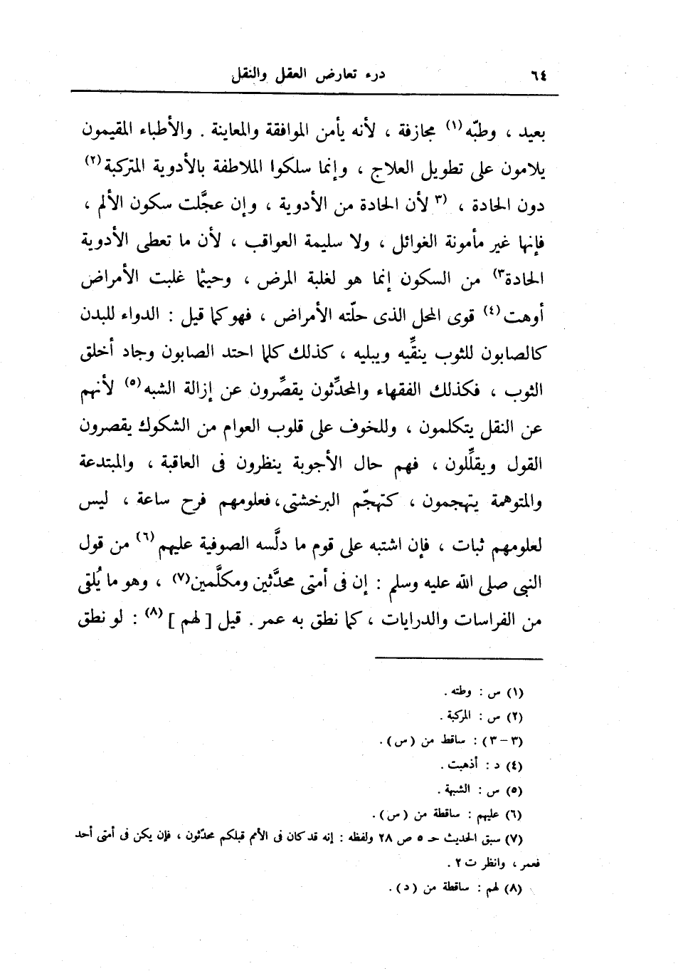 والأطباء المقيمون يلامون على تطويل العلاج، وإنما سلكوا الملاطفة بالأدوية المتركبة دون الحادة من الأدوية، وإن عجلت سكون الألم، فإنها غير مأمونة الغوائل، ولا سليمة العواقب، لأن ماتعطى الأدوية الحادة من السكون إنما هو لغلبة المرض، وحيثما غلبت الأمراض أوهت قوى المحل الذي حلته الأمراض، فهو كما قيل: الدواء للبدن كالصابون للثوب ينقيه ويبليه، كذلك كلما احتد الصابون وجاد أخلق الثوب، فكذلك الفقهاء والمحدثون يقصرون عن إزالة الشبه.