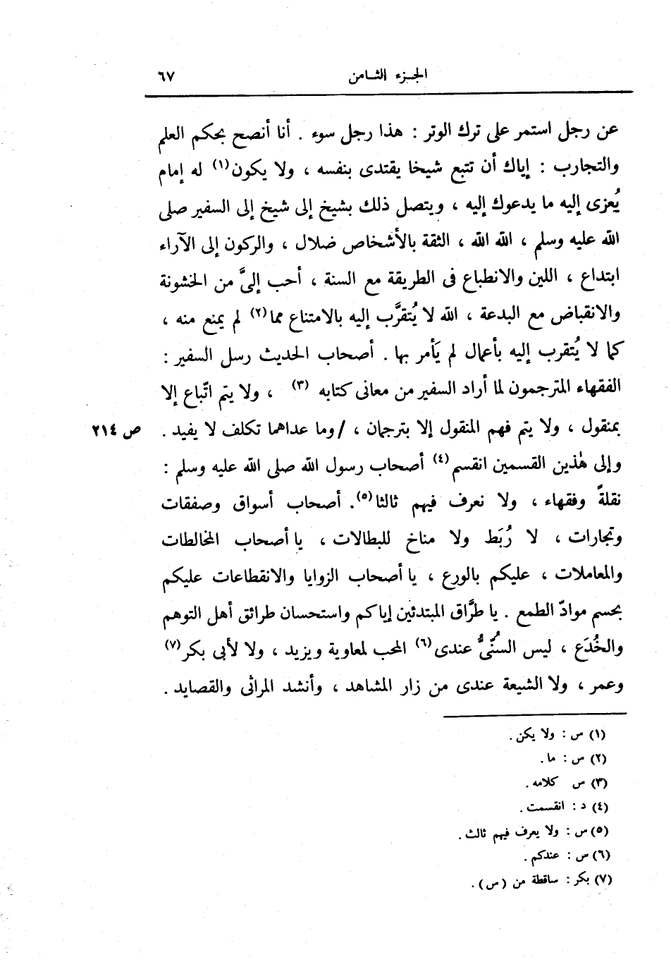 اصحاب الحديث رسل السفير: الفقهاء المترجمون لما أراد السفير من معاني كتابه، ولا يتم اتباع إلا بمنقول، ولا يتم فهم المنقول إلا بترجمان، وما عداهما تكلف لا يفيد.