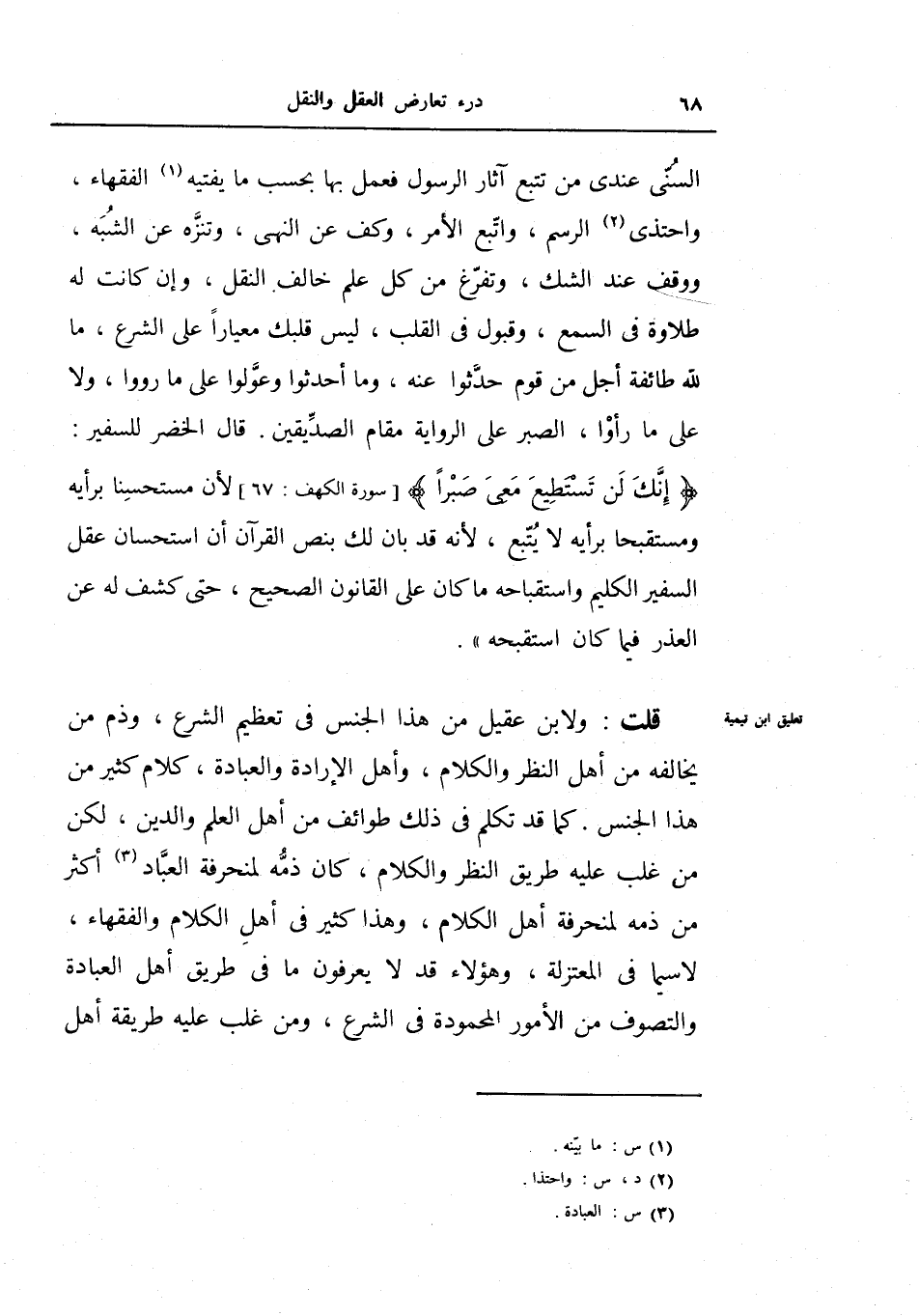 قال الخضر للسفير: {إنك لن تستطيع معي صبرا} لأن مستحسناً برأيه ومستقبحاً برأيه لا يتبع، لأنه قد بان لك بنص القرآن أن استحسان عقل السفير الكليم واستقباحه ما كان على القانون الصحيح، حتى كشف له عن العذر فيما كان استقبحه) .