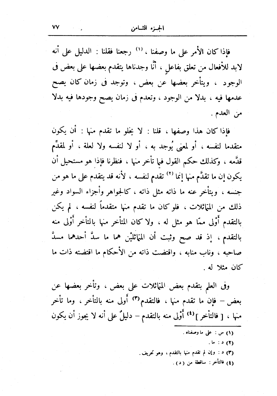 فإذا كان هذا وصفها، قلنا: لا يخلو ما تقدم منها: أن يكون متقدماً لنفسه، أو لمعنى يوجد به، أو لا لنفسه ولا لعلة، أولمقدم قدمه، وكذلك حكم القول فيما تأخر منها، فنظرنا فإذا هو مستحيل أن يكون إن ما تقدم منها إنما تقدم لنفسه، لأنه قد يتقدم على ما هو جنسه، وتأخر عنه ما ذاته مثل ذاته، كالجواهر وأجزاء السواد وغير ذلك من المتماثلات، فلو كان ما تقدم منها متقدماً لنفسه، لم يكن بالتقدم أولى مما هو مثل له، ولا كان المتأخر منها بالتأخر أولى منه بالتقدم، إذ قد صح وثبت أن المتماثلين هما ما سد أحدهما مسد صاحبه، وناب منابه، واقتضت ذاته من الأحكام ما اقتضته ذات ما كان مثلاً له.