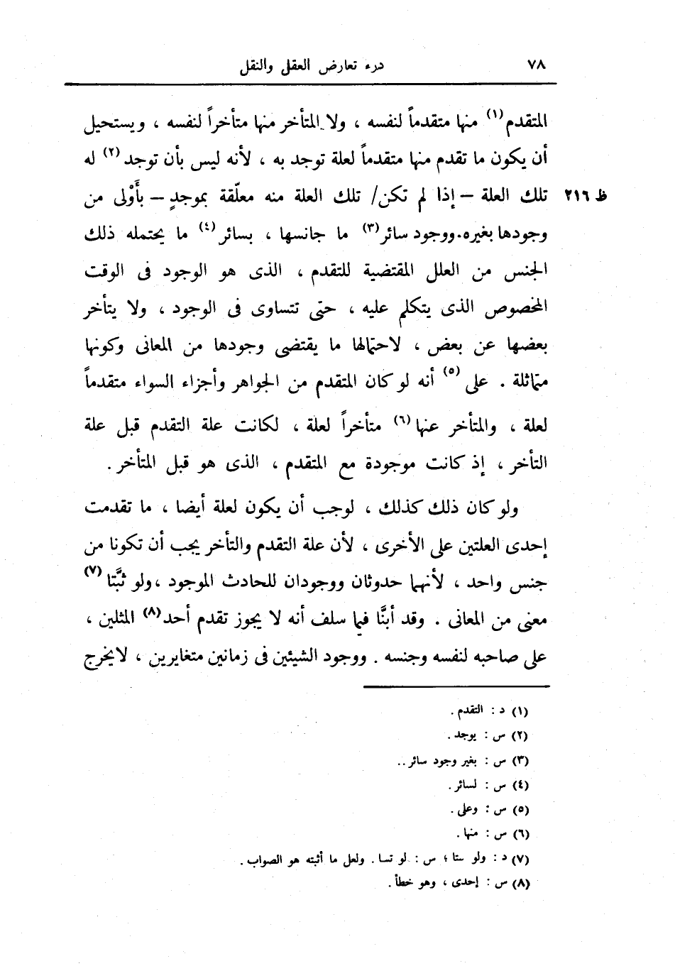 ولو كان ذلك كذلك، لوجب أن يكون لعلة ايضاً، ما تقدمت إحدى العلتين على الأخرى، لأن علة التقدم والتأخر يجب أن تكونا من جنس واحد، لأنهما حدوثان ووجودان للحادث الموجود، ولو ثبتا معنى من المعاني.