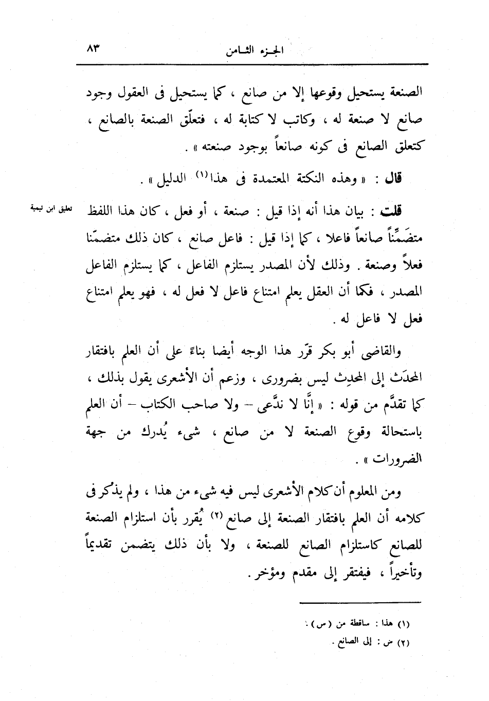 الصنعة يستحيل وقوعها إلا من صانع، كما يستحيل في العقول وجود صانع لا صنعة له، وكاتب لا كتابة له، فتعلق الصنعة بالصانع، كتعلق الصانع في كونه صانعاً بوجود صنعته) .