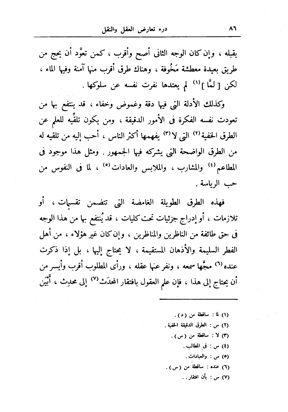 فهذه الطرق الطويلة الغامضة التي تتضمن تقسيمات، أو تلازمات، أو إدراج جزيئات تحت كليات، قد ينتفع بها من هذا الوجه في حق طائفة من الناظرين والمناظرين، وإن كان غير هؤلاء، من أهل الفطر السليمة والأذهان المستقيمة، لا يحتاج إليها، بل إذا ذكرت عنده مجها سمعه، ونفر عنها عقله، ورأى المطلوب أقرب وأيسر من أن يحتاج إلى هذا، فإن علم العقول بافتقار المحدث إلى محدث، أبين