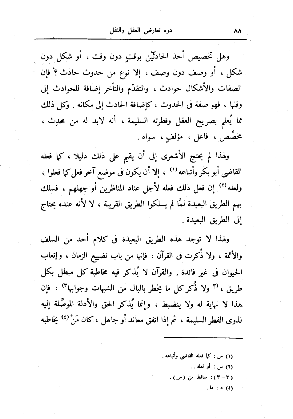 ولهذا لم يحتج الأشعري إلى أن يقيم على ذلك دليلاً، كما فعله القاضي أبو بكر وأتباعه، إلا أن يكون في موضع آخر فعل كما فعلوا، ولعله إن فعل ذلك لأجل عناد المناظرين أو جهلهم، فسلك بهم الطريق البعيدة لما لم يسلكوا الطريق القريبة، لا لأنه عنده يحتاج إلى الطريق البعيدة.