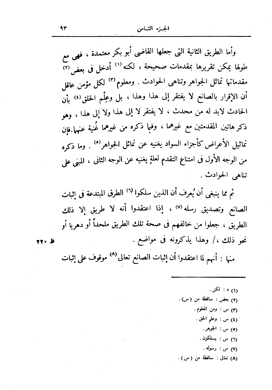 وأما الطريق الثانية التي جعلها القاضي أبو بكر معتمدة، فهي مع طولها يمكن تقريرها بمقدمات صحيحة، لكنه أدخل في بعض مقدماتها تماثل الجواهر وتناهي الحوادث.