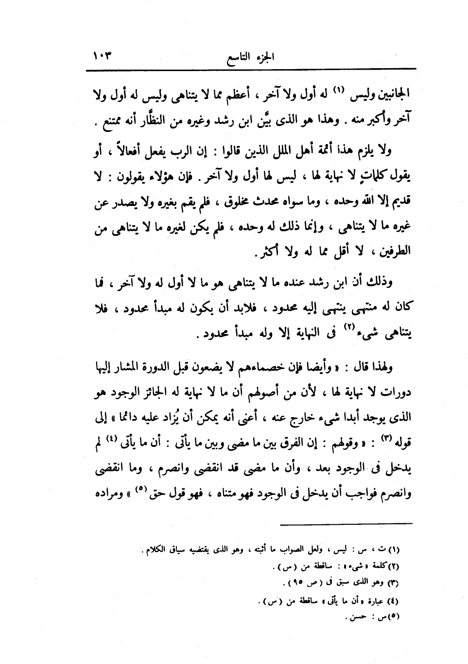 ولهذا قال: وأيضاً فإن خصماءهم لا يضعون قبل الدورة المشار إليها دورات لا نهاية لها، لأن من أصولهم أن ما لا نهاية له الجائز الوجود هو الذي يوجد أبداً شيء خارج عنه، أعني أنه يمكن أن يزاد عليه دائماً إلى قوله: (إن الفرق بين ما مضى وبين ما يأتي: أن ما يأتي لم يدخل في الوجود بعد، وأن ما مضى قد انقضى وانصرم، وما انقضى ونصرم فواجب أن يدخل في الوجود فهو متناه، فهو قول حق ومراده
