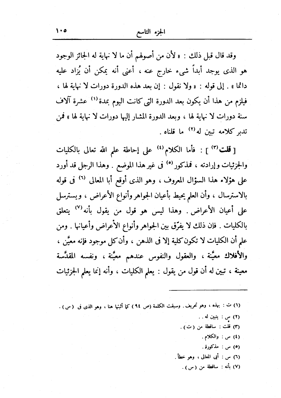 إلى قوله: ولا نقول: إن بعد هذه الدورة دورات لا نهاية لها، فيلزم من هذا أن يكون بغد الدورة التي كانت اليوم بمدة عشرة آلاف سنة دورات لا نهاية لها وبعد الدورة المشار إليها دورات لا نهاية لها فمن تدبر كلامه تبين له ما قلناه.