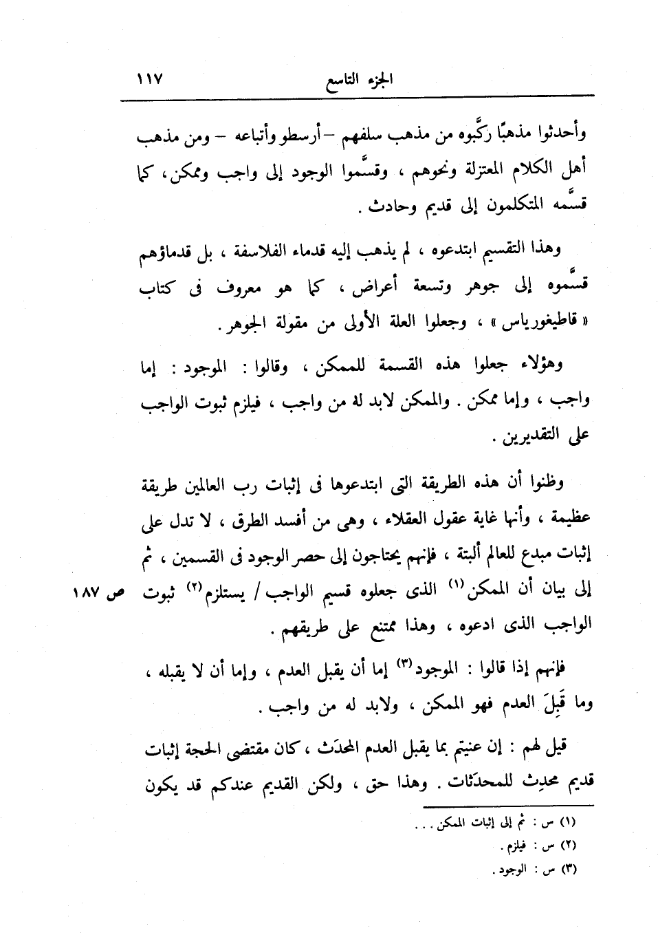 وأحدثوا مذهباً ركبوه من مذهب سلفهم- أرسطو وأتباعه-ومن مذهب أهل الكلام المعتزلة ونحوهم، وقسموا الوجود إلى واجب ممكن، كما قسمه المتكلمون إلى قديم وحادث 0