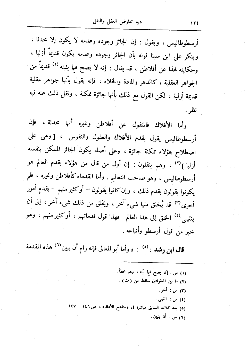 أرسطو طاليس، ويقول: إن الجائز وجوده وعدمه لا يكون إلا محدثاً، وينكر على ابن سينا قوله بأن الجائز وجوده وعدمه يكون قديماً أزلياً، وحكايته لهذا عن أفلاطون، قد يقال: إنه لا يصح فيما يثبته قديماً من الجواهر العقلية، كالدهر والمادة والخلاء، فإنه يقول بأنها جواهر عقلية قديمة أزلية، لكن القول مع ذلك بأنها جائزة ممكنة، ونقل ذلك عنه فيه نظر.