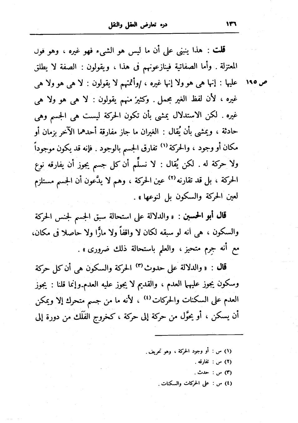 قال: والدلالة على حدوث الحركة والسكون هي أن كل حركة وسكون يجوز