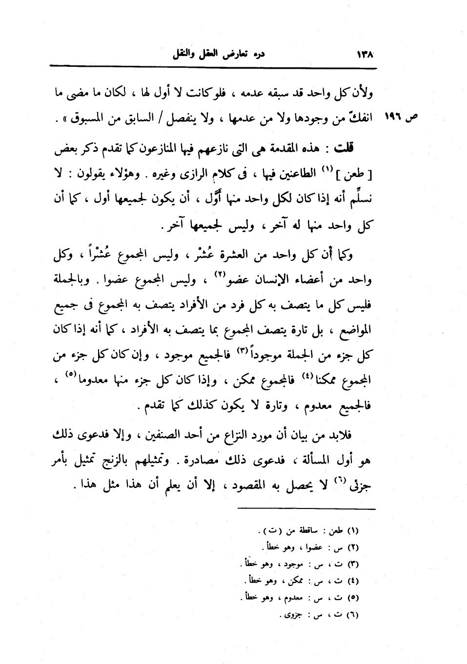 وكما أن كل واحد من العشرة عشر، وليس المجموع عشراً، وكل واحد من أعضاء الإنسان عضو، وليس المجموع في جميع المواضع، بل تارة يتصف المجموع بما يتصف به الأفراد، كما أنه إذا كان كل جزء من الجملة موجوداً فالجميع موجود، وإن كان كل جزء من المجموع ممكناً فالمجموع ممكن، وإذا كان كل جزء منها معدوماً، فالجميع معدوم، وتارة لا يكون كذلك كما تقدم.