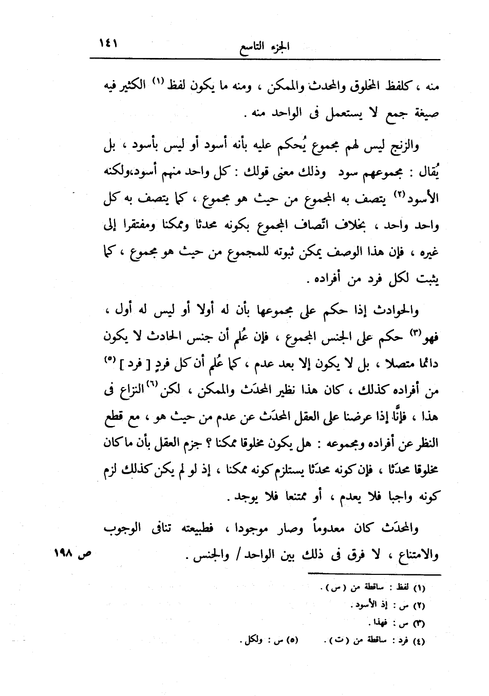 والزنج ليس لهم مجموع يحكم عليه بأنه أسود أو ليس بأسود، بل يقال: مجموعهم سود وذلك معنى قولك: كل واحد منهم أسود، ولكنه الأسود يتصف به المجموع من حيث هو مجموع، كما يتصف به كل واحد واحد.