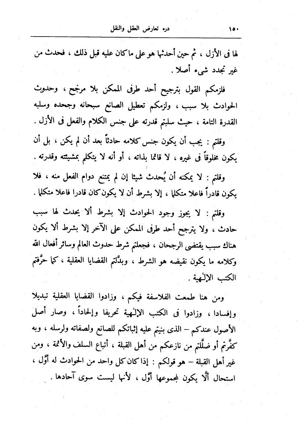 وقلتم: لا يجوز وجود الحوادث إلا بشرط ألا يحدث لها سبب حادث، ولا يترجح أحد طرفي الممكن على الآخر إلا بشرط ألا يكون هناك سبب يقتضي الرجحان، فجعلتم شرط حدوث العالم وسائر أفعال الله وكلامه ما يكون نقيضه هو الشرط، وبدلتم الفضايا العقلية، كما حرفتم الكتب الإلهية.