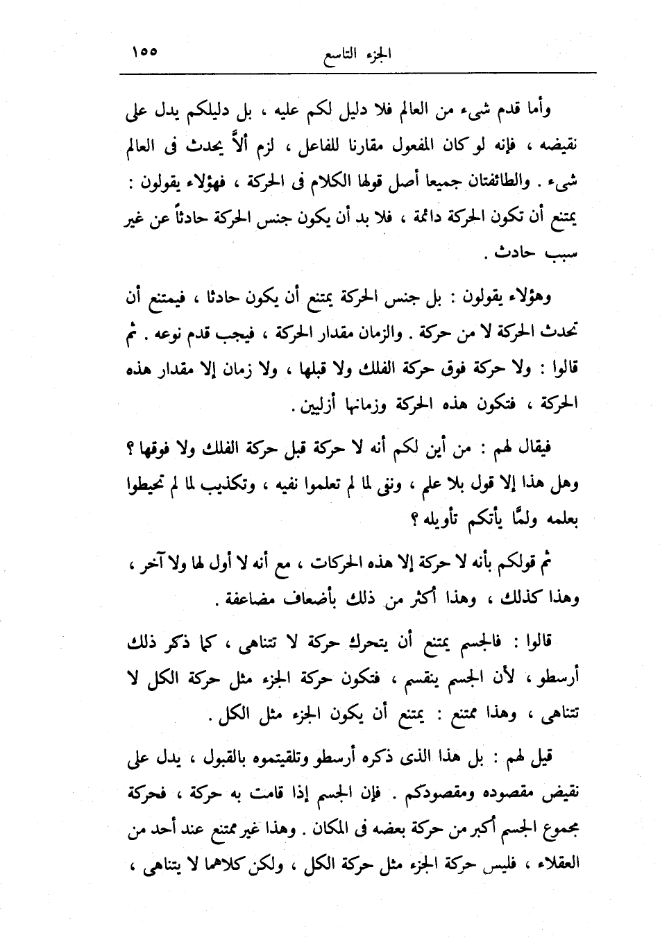 قالوا: فالجسم يمتنع أن يتحرك حركة لا تتناهى، كما ذكر ذلك أرسطو، لأن الجسم ينقسم، فتكون حركة الجزء مثل حركة الكل لا تتناهى، وهذا ممتنع: يمتنع أن يكون الجزء مثل الكل.