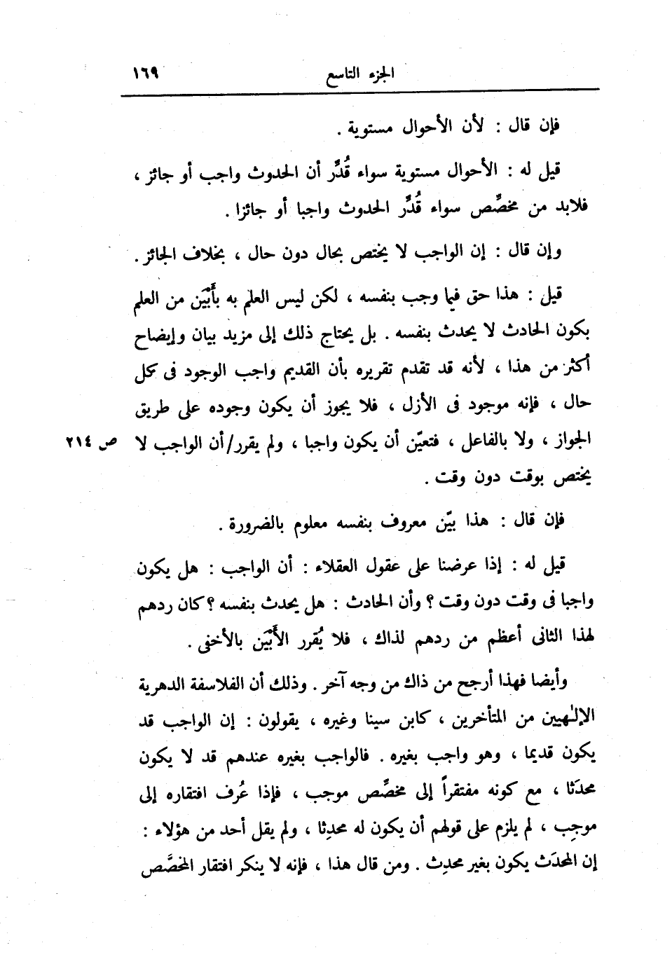 بل يحتاج ذلك إلى مزيد بيان وإيضاح أكثر من هذا، لأنه قد تقدم تقريره بأن القديم واجب الوجود في كل حال، فإنه موجود في الأزل، فلا يجوز أن يكون وجوده على طريق الجواز، ولا بالفعل، فتعيين أن يكون واجباً، ولم يقرر أن الواجب لا يختص بوقت دون وقت.