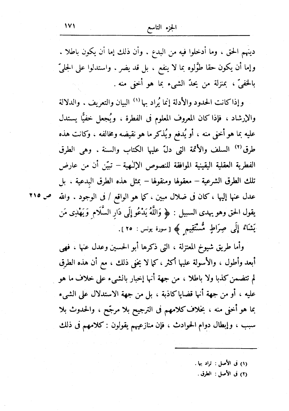وإذا كانت الحدود والأدلة إنما يراد بها البيان والتعريف، والدلالة والإرشاد فإذا كان المعروف المعلوم في الفطرة، ويجعل خفياً يستدل عليه بما هو أخفى منه، أو يدفع ويذكر ما هو نقيضه ومخالفه، وكانت هذه طرق السلف والأئمة التي دل عليها الكتاب والسنة، وهي الطرق الفطرية العقلية اليقينية الموافقة للنصوص الإلهية -تبين أن من عارض تلك الطرق الشرعية - معقولها ومنقولها - بمثل هذه الطرق البدعية، بل عدل عنها إليها، كان في ضلال مبين، كما هو الواقع في الوجود، والله يقول الحق وهو يهدي السبيل: {والله يدعو إلى دار السلام ويهدي من يشاء إلى صراط مستقيم} .
