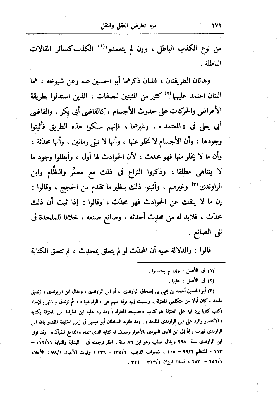 وهاتان الطريقتان، اللتان ذكرهما أبو الحسين عنه وعن شيوخه، هما اللتان اعتمد عليهما كثير من المثبتين للصفات، الذين استدلوا بطريقة الأعراض والحركات على حدوث الأجسام، كالقاضي أبي بكر، والقاضي أبي يعلى في المعتمد) ، وغيرهما، فإنهم سلكوا هذه الطريق فأثبتوا وجودها، وأن الأجسام لا تخلو عنها، وأنها لا تبقى زمانين، وأنها محدثة، وأن ما لا يخلو منها فهو محدث، لأن الحوادث لها أول، وأبطلوا وجود ما لا يتناهى مطلقاً، وذكروا النزاع في ذلك مع معمر والنظام وابن الراوندي وغيرهم، وأثبتوا ذلك بنظير ما تقدم من الحجيج، وقالوا: إن ما لا ينفك عن الحوادث فهو محدث، وقالوا: إذا ثبت أن ذلك محدث، فلا بد له من محدث أحداثه، وصانع صنعه، خلافاً للملحدة في نفي الصانع.