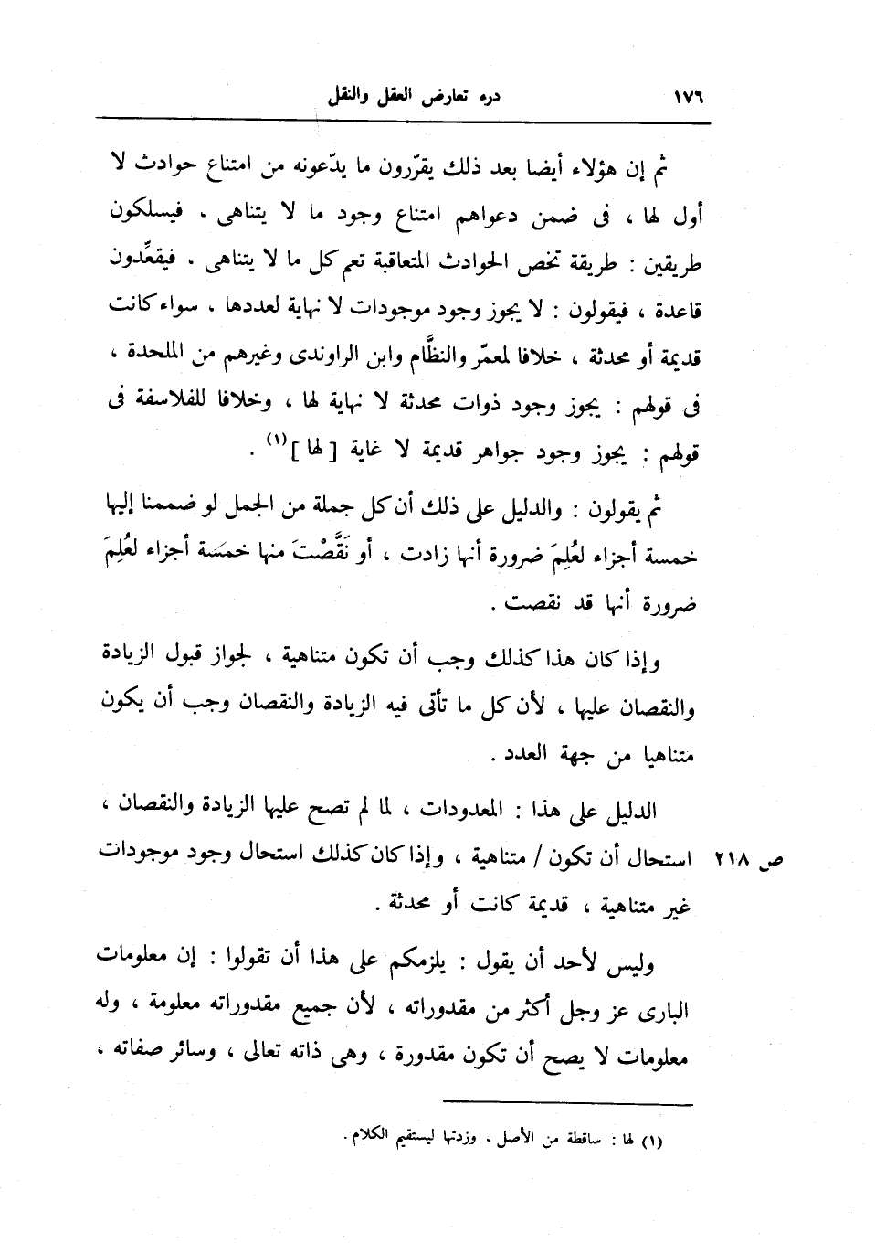 ثم إن هؤلاء أيضاً بعد ذلك يقررون ما يدقونه من امتناع حوادث لا أول لها، في ضمن دعواهم امتناع وجود ما لا يتناهى، فيقعدون قاعدة، فبقولون: لا يجوز وجود موجودات لا نهاية لعددها، سواء كانت قديمة أو محدثة، خلافاً لمعمر والنظام وابن الراوندي وغيرهم من الملحدة، في قولهم: يجوز وجود ذوات محدثة لا نهاية لها، وخلافاً للفلاسفة في قولهم: يجوز وجود جواهر قديمة لا غاية لها 0