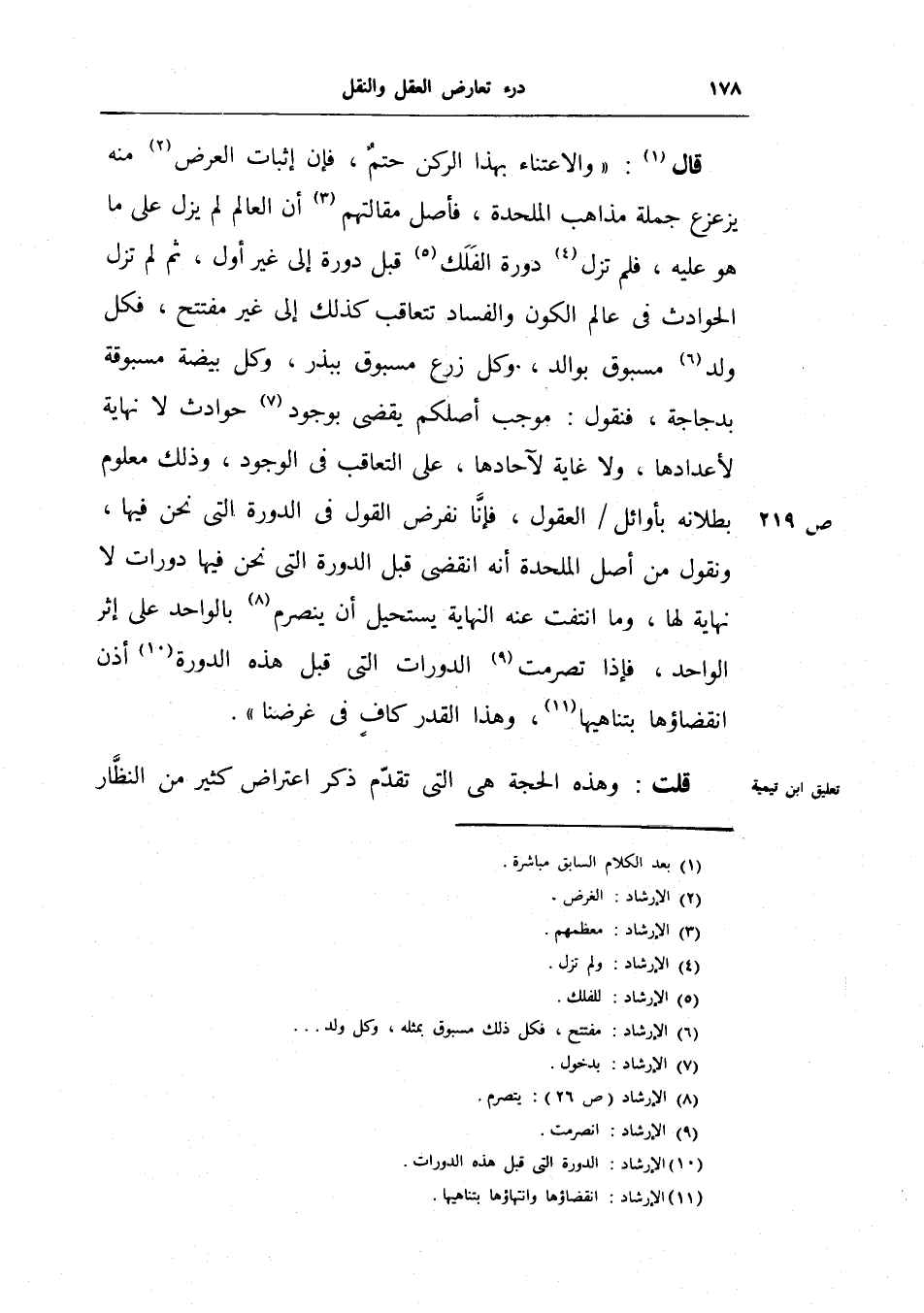 قال: والاعتناء بهذا الركن حتم، فإن إثبات العرض منه يزعزع جملة مذاهب الملحدة، فأصل مقالتهم أن العالم لم يزل على ما هو عليه، فلم تزل دورة الفلك قبل جورة إلى غير أول، ثم لم تزل الحوادث في عالم الكون والفساد تتعاقب كذلك إلى غير مفتتح، فكل ولد مسبوق بوالد، وكل زرع مسبوق ببذر، وكل بيضة مسبوقة بدجاجة، فنقول: موجب أصلكم يقضي بوجود حوادث لا نهاية لأعدادها، ولا غاية لآحادها، على التعاقب في الوجود، وذلك معلوم بطلانه بأوائل العقول، فإنا نفرض القول في الدورة التي نحن فيها، ونقول من أصل الملحدة أنه انقضى قبل الدورة التي نحن فيها دورات لا نهاية لها، وما انتفت عنه النهاية يستحيل أن ينصرم بالواحد على إثر الواحد، فإذا تصرمت الدورات التي قبل هذه الدورة أذن انقضاؤها بتناهيها، وهذا القدر كاف في غرضنا.