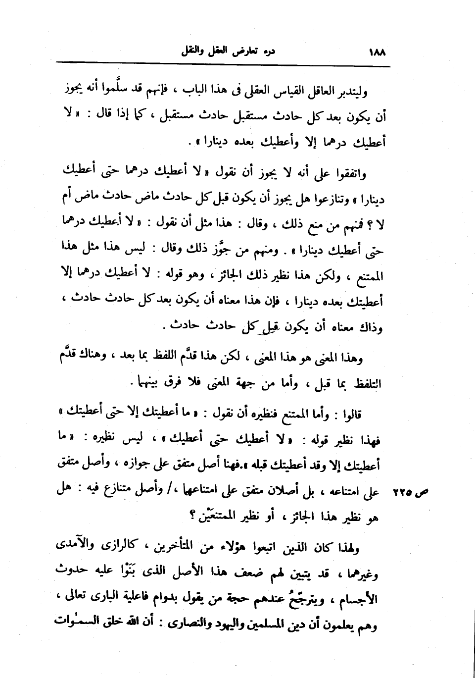 ولهذا كان الذين اتبعوا هؤلاء من المتأخرين، كالرازي والآمدي وغيرهما، قد يتبين لهم ضعف هذا الأصل الذي بنوا عليه حدوث الأجسام، ويترجح عندهم حجة من يقول بدوام فاعلية الباري تعالى، وهم يعلمون أن دين المسلمين واليهود والنصارى: أن الله خلق السموات