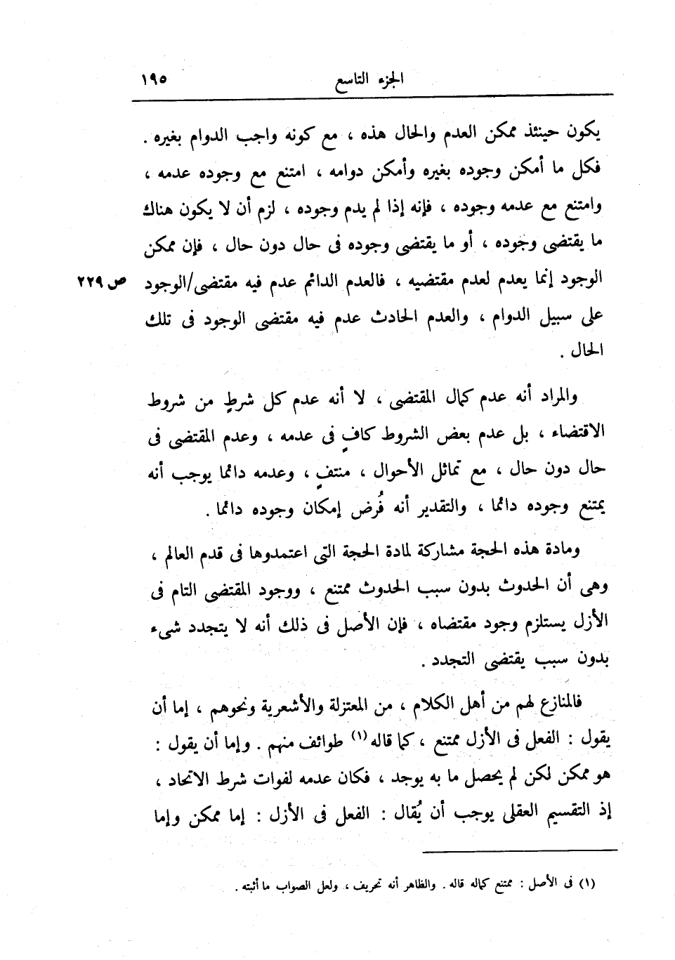 والمراد أنه عدم كمال المقتضى، لا أنه عدم كل شرط من شروط الاقتضاء، بل عدم بعض الشروط كاف في عدمه، وعدم المقتضى في حال دون حال، مع تماثل الأحوال، منتف، وعدمه دائماً يوجب أنه يمتنع وجوده دائماً، والتقدير أنه فرض إمكان وجوده دائماً.