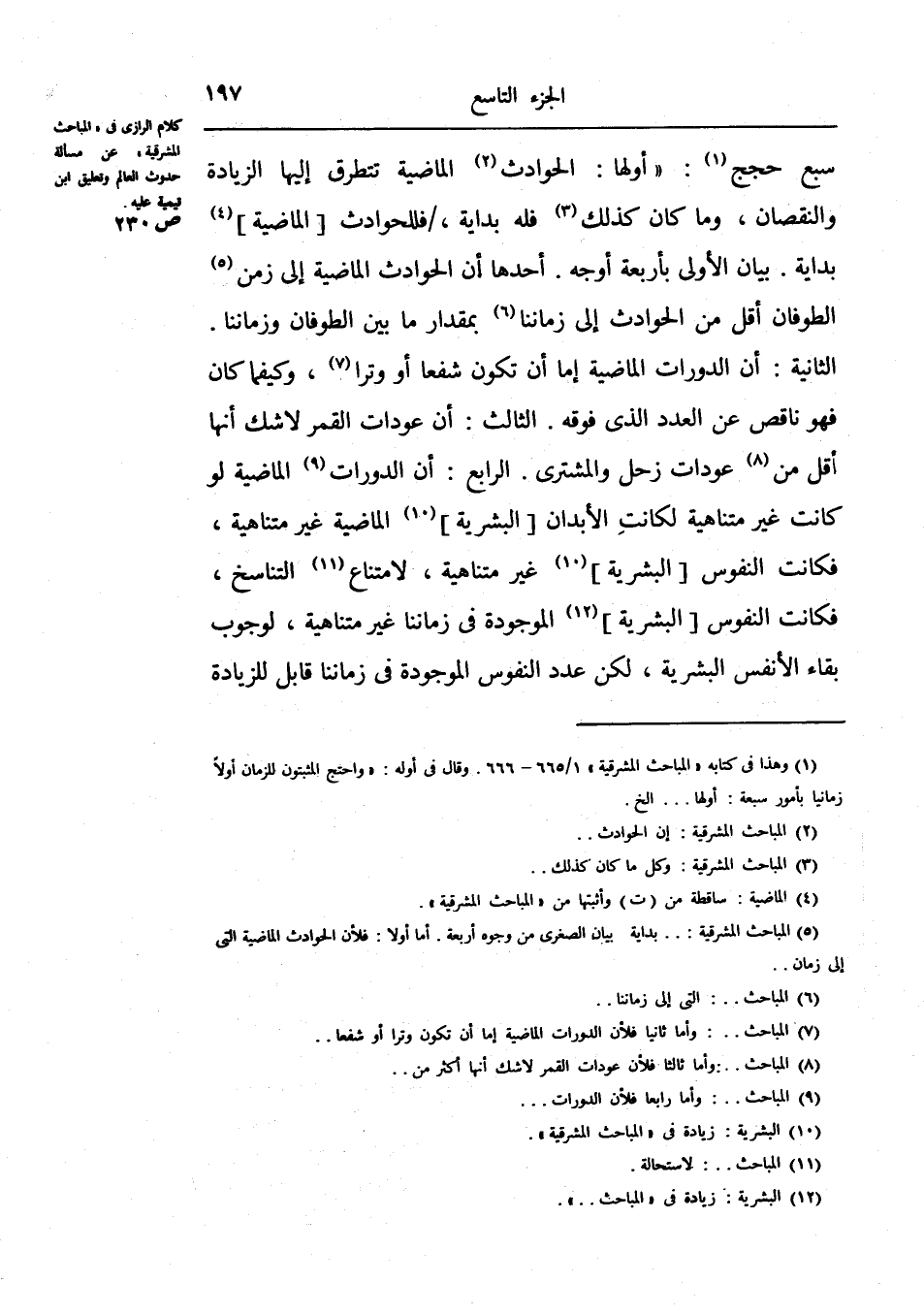 أحدها أن الحوادث الماضية إلى زمن الطوفان أقل من الحوادث إلى زماننا بمقدار ما بين الطوفان وزماننا.