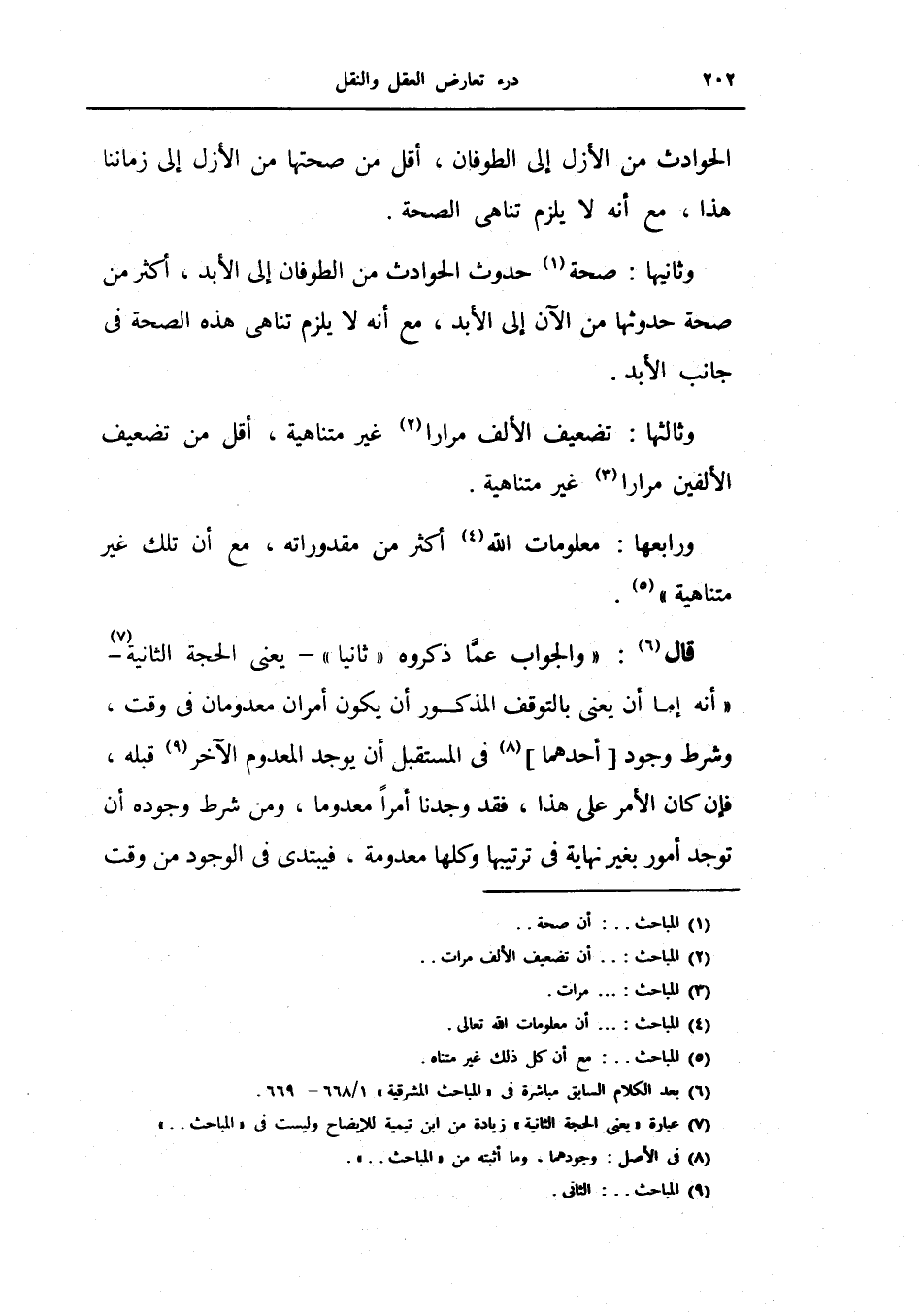 وثانيها: صحة حدوث الحوادث من الطوفان إلى الأبد، أكثر من صحة حدوثها من الآن إلى الأبد، مع أنه لا يلزم تناهي هذه الصحة في جانب الأبد.