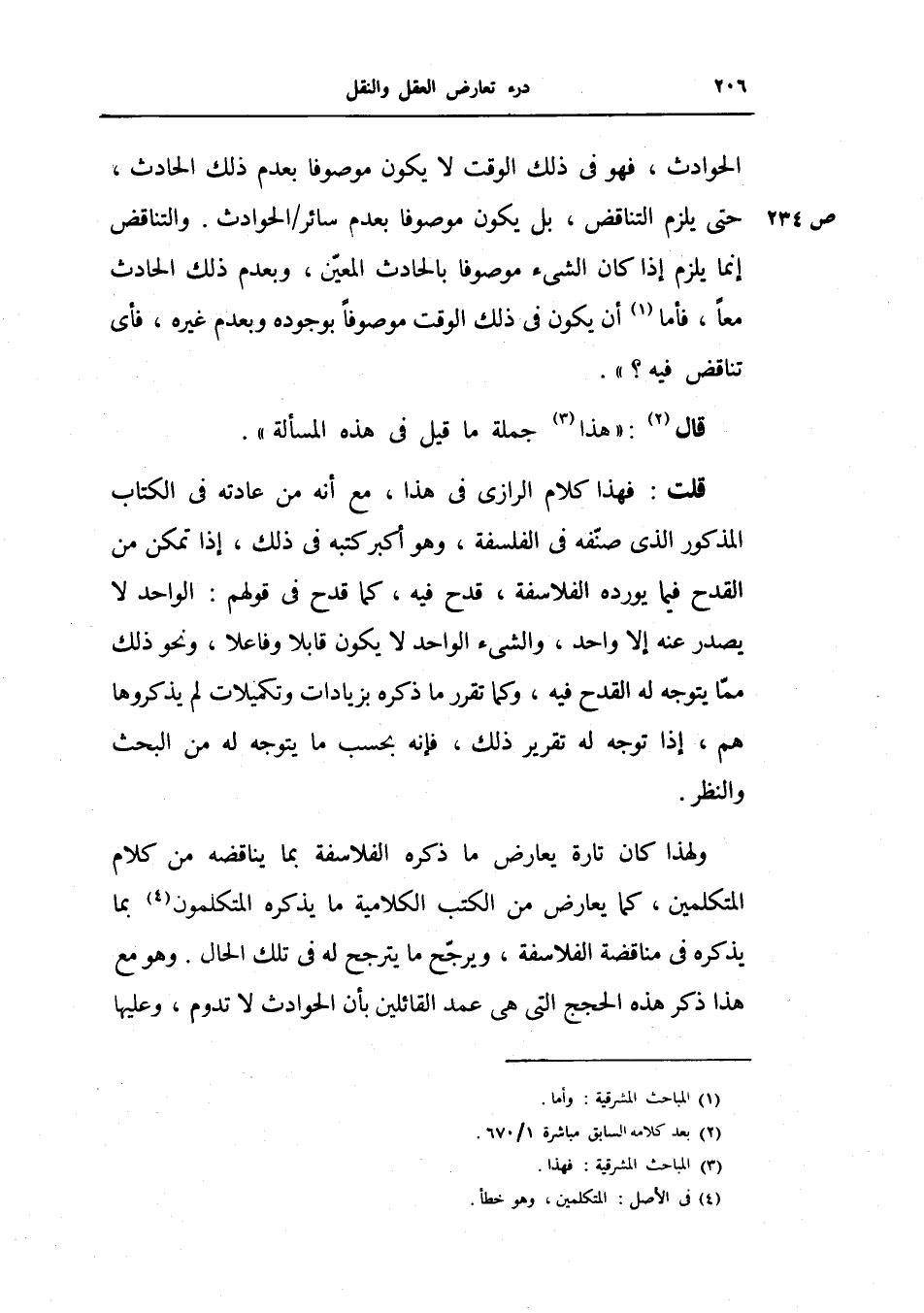 قلت: فهذا كلام الرازي في هذا، مع أنه من عادته في الكتاب المذكور الذي صنفه في الفلسفة، وهو أكبر كتبه في ذلك، إذا تمكن من القدح فيما يورده الفلاسفة، قدح فيه، كما قدح في قولهم: الواحد لا يصدر عنه إلا واحد، والشيء الواحد لا يكون قابلاً وفاعلاً، ونحو ذلك مما يتوجه له القدح فيه، وكما تقرر ما ذكره بزيادات وتكميلات لم يذكروها هم، إذا توجه له تقرير ذلك، فإنه بحسب ما يتوجه له من البحث والنظر.