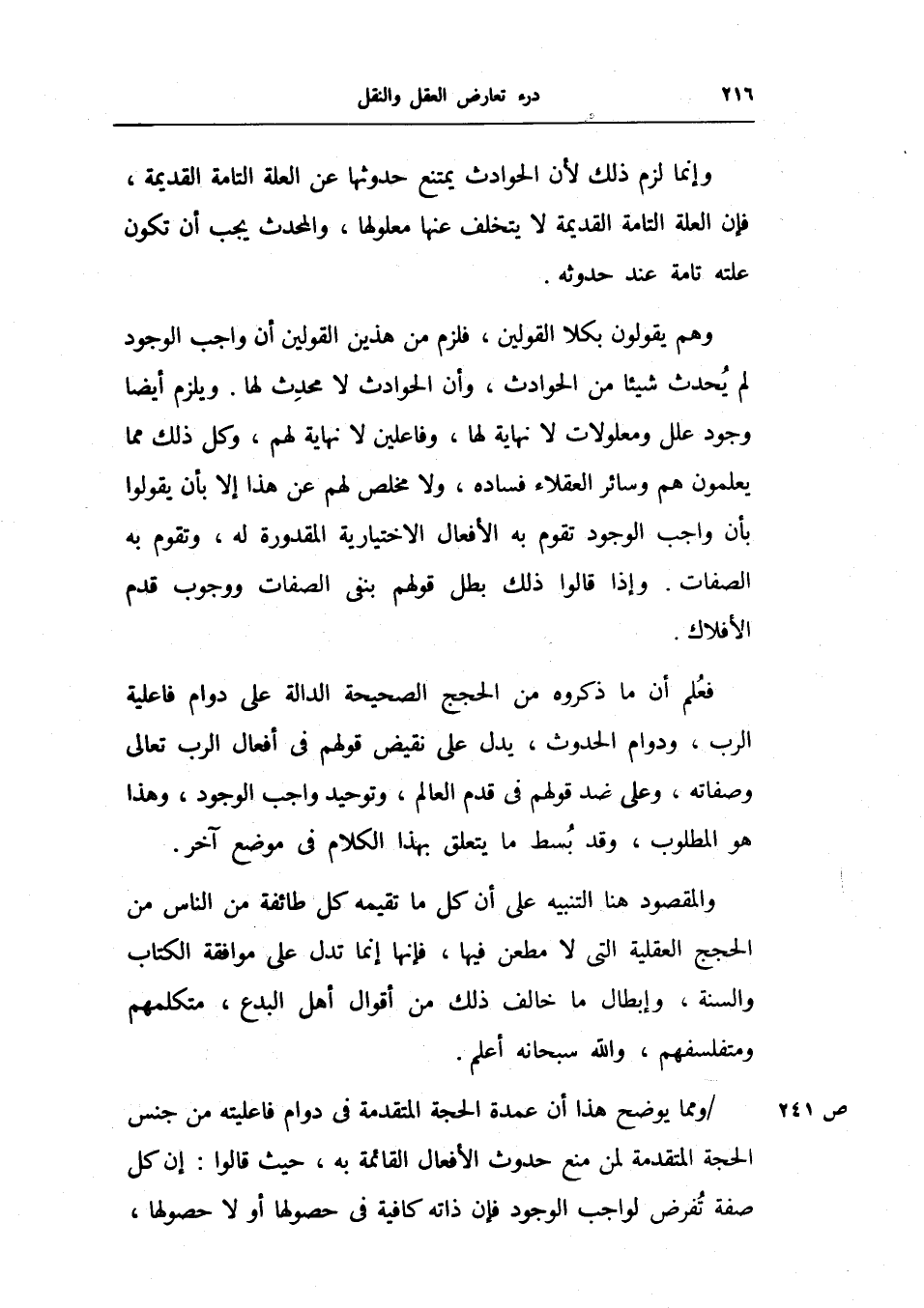 ويلزم أيضاً وجود علل ومعلولات لا نهاية لها، وفاعلين لا نهاية لهم، وكل ذلك مما يعلمون هم وسائر العقلاء فساده، ولا مخلص لهم عن هذا إلا بأن يقولوا بأن واجب الوجود تقوم به الأفعال الاختيارية المقدورة له، وتقوم به الصفات.