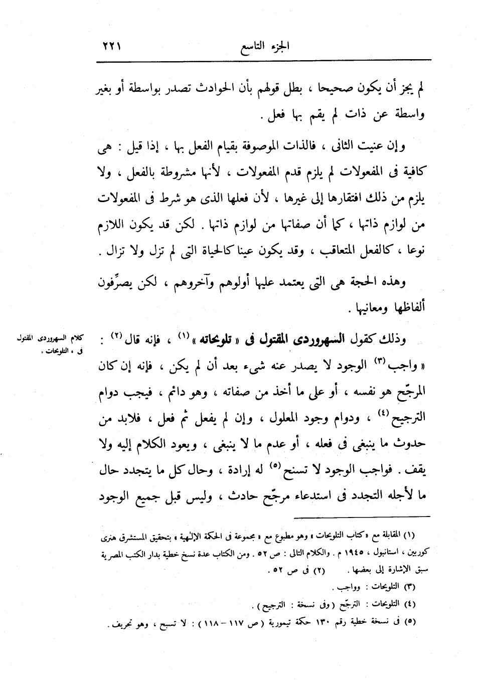 وذلك كقول السهروري المقتول في تلويحاته، فإنه قال: واجب الوجود لا يصدر عنه شيء بعد أن لم يكن، فإنه إن كان المرجح هو نفسه، أو على ما أخذ من صفاته، وهو دائم، فيجب دوام الترجيح، ودوام وجود المعلول، وإن لم يفعل ثم فعل، فلا بد من حدوث ما ينبغي في فعله، أو عدم ما لا ينبغي، ويعود الكلام إليه ولا يقف.