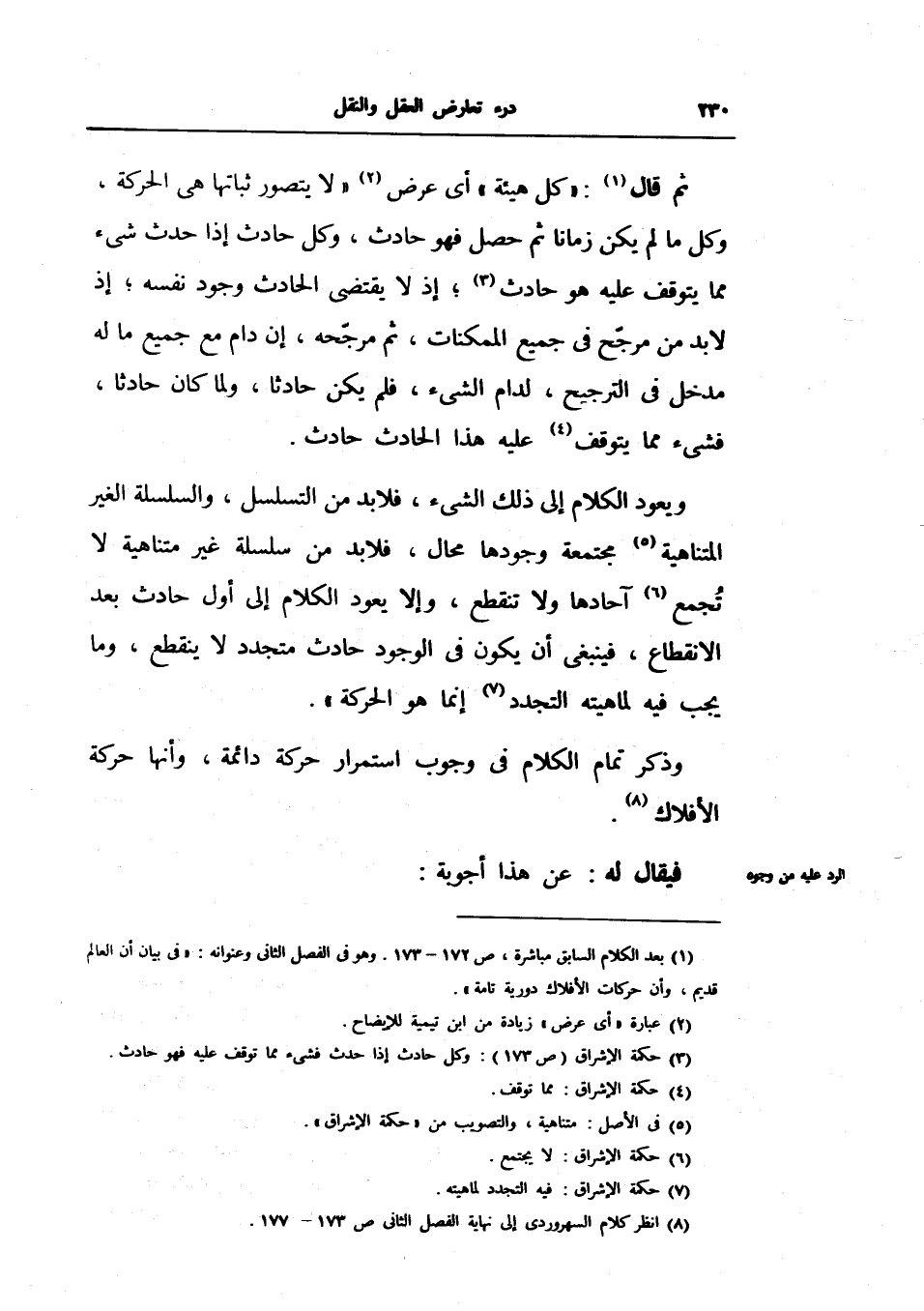 ويعود الكلام إلى ذلك الشيء، فلا بد من التسلسل، والسلسلة الغير المتناهية مجتمعة وجودها محال، فلا بد من سلسلة غير متناهية لا تجمع آحادها ولا تنقطع، وإلا يعود الكلام إلى أول حادث بعد الانقطاع، فينبغي أن يكون الوجود حادث متجدد لا ينقطع، وما يجب فيه لماهيته التجدد إنما هو الحركة.