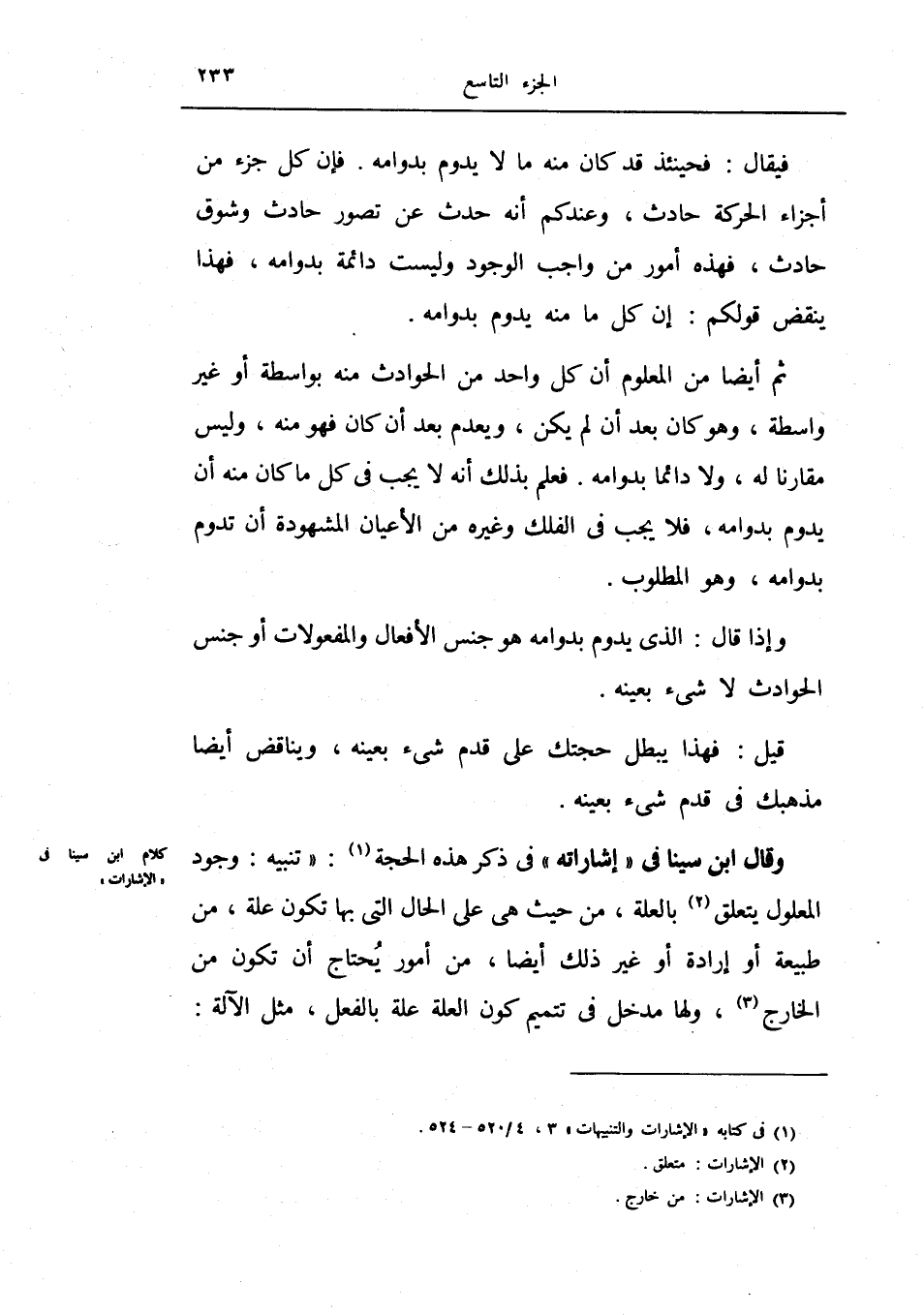وقال ابن سينا: في إشاراته في ذكر هذه الحجة: تنبيه: وجود المعلول يتعلق بالعلة، من حيث هي على الحال التي بها تكون علة، من طبيعة أو إرادة أو غير ذلك أيضاً، من أمور يحتاج أن تكون من الخارج، ولها مدخل في تتميم كون العلة بالفعل، مثل الآلة: