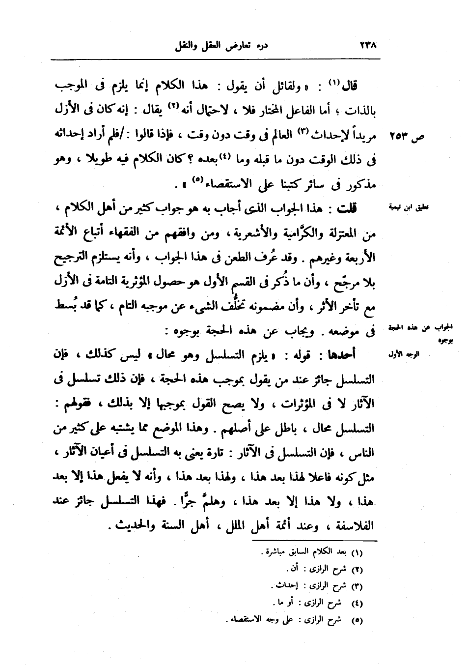 قال: ولقائل أن يقول: هذا الكلام إنما يلزم في الموجب بالذات، أما الفاعل المختار فلا، لاحتمال أنه يقال: إنه كان في الأزل مريداً لإحداث العالم في وقت دون وقت، فإذا قالوا: فلم أراد إحداثه في ذلك الوقت دون ما قبله وما بعده؟ كان الكلام فيه طويلاً، وهو مذكور في سائر كتبنا على الاستقصاء.