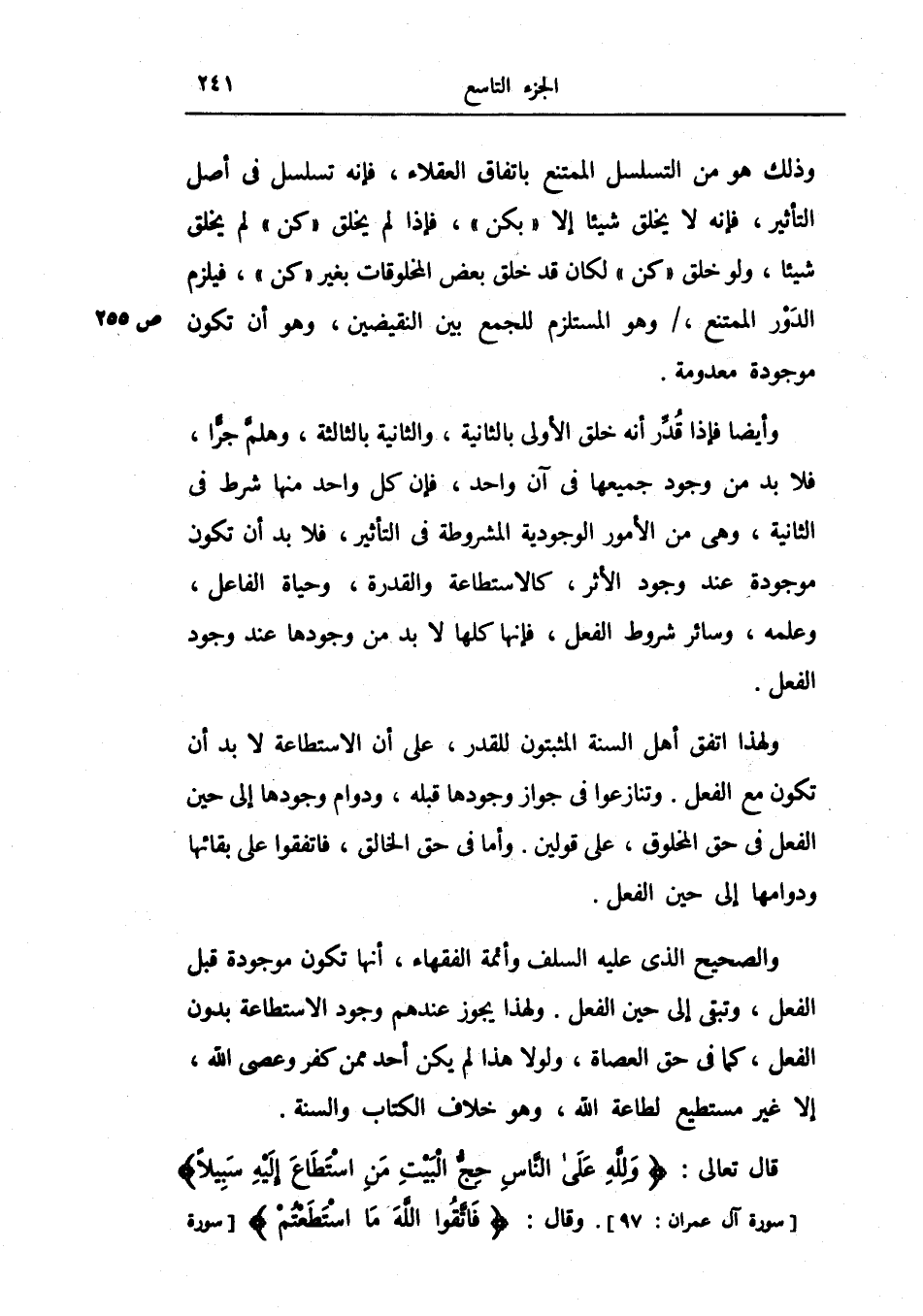 ولهذا اتفق أهل السنة المثبتون للقدر، على أن الاستطاعة لا بد أن تكون مع الفعل وتنازعوا في جواز وجودها قبله، ودوام وجودها إلى حين الفعل في حق المخلوق، على قولين.