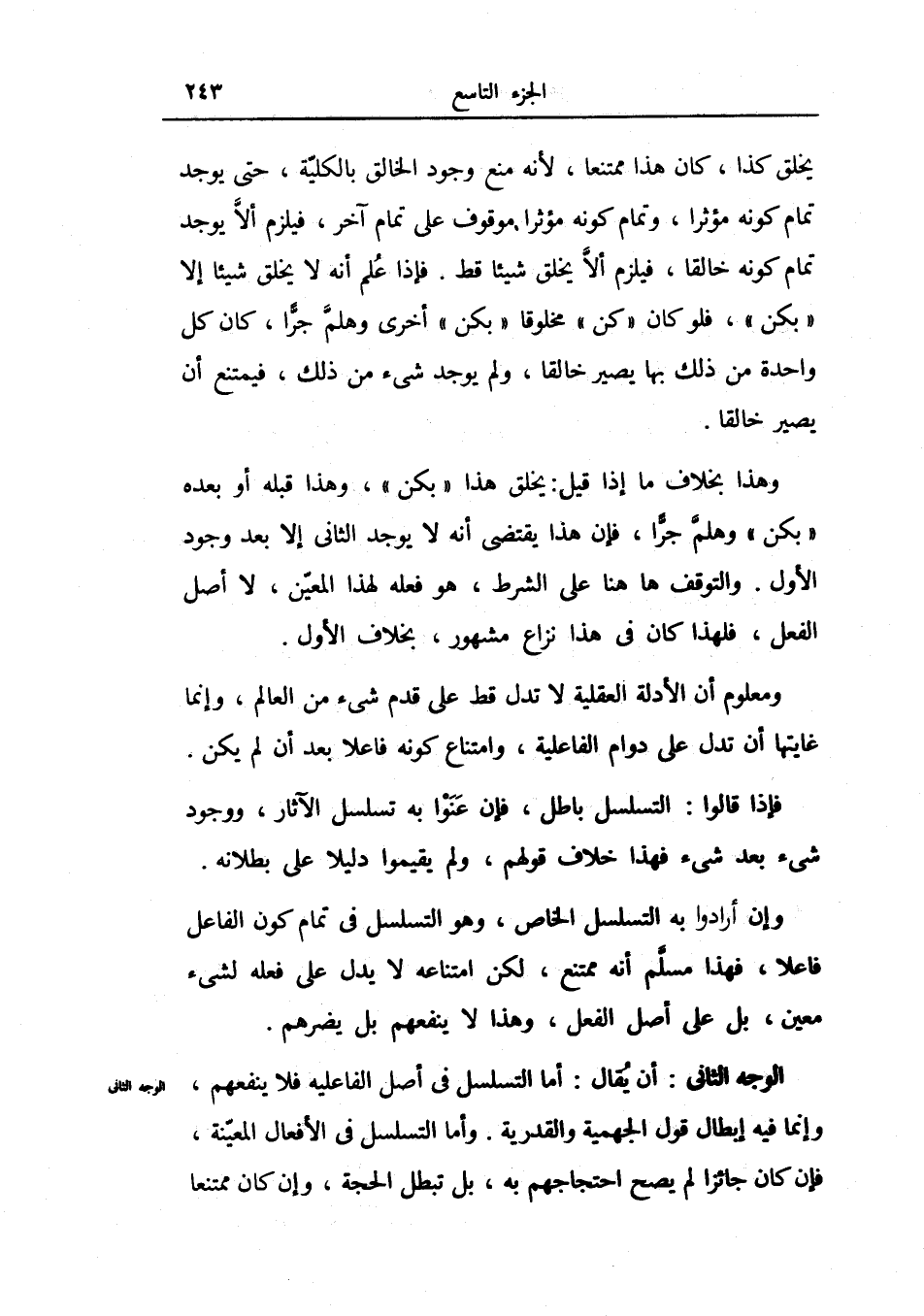 يخلق كذا، كان هذا ممتنعاً، لأنه منع وجود الخالق بالكلية، حتى يوجد تمام كونه مؤثراً، وتمام كونه مؤثراً موقوف على تمام آخر، فيلزم ألا يوجد تمام كونه خالقاً، فيلزم ألا يخلق شيئاً قط.