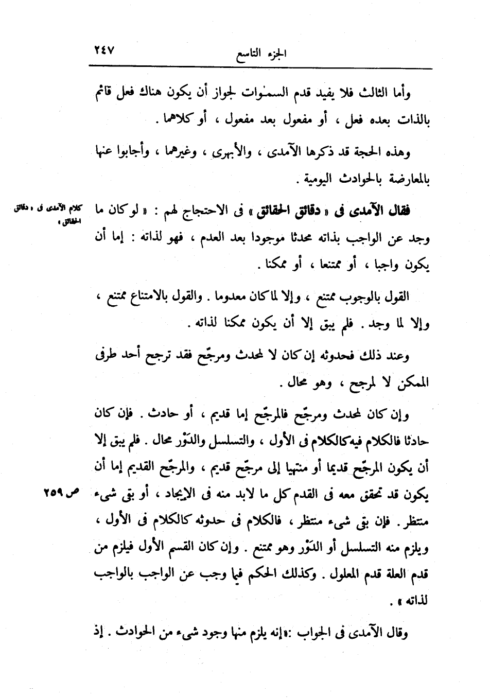 وقال الآمدي في الجواب: إنه يلزم منها وجود شيء من الحوادث.