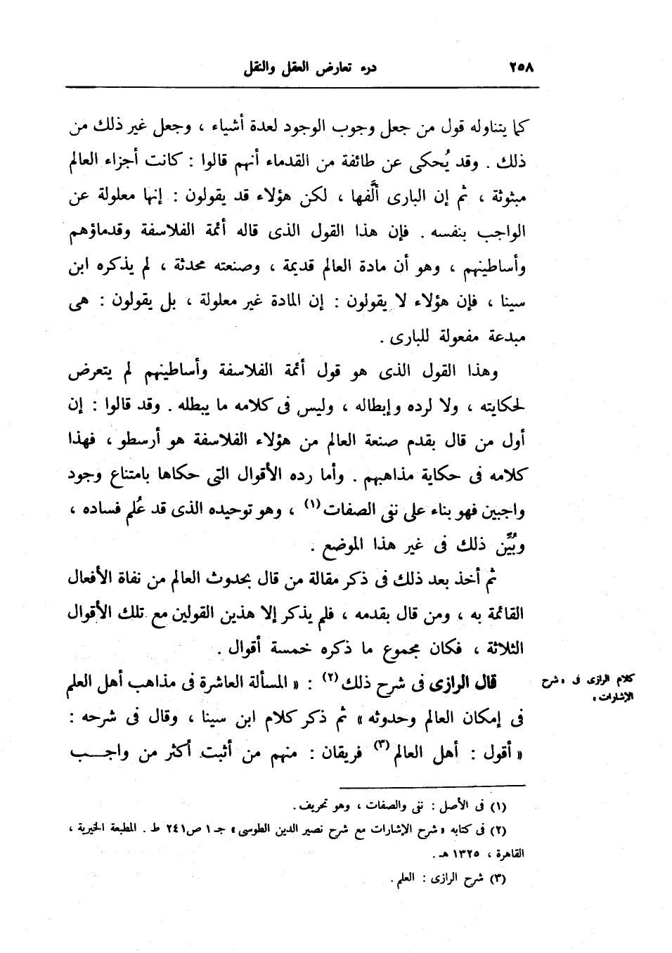 قال الرازي في شرح ذلك: المسألة العاشرة في مذاهب أهل العلم في إمكان العالم وحدوثه ثم ذكر كلام ابن سينا، وقال في شرحه: أقول: أهل العالم فريقان: منهم من أثبت أكثر من واجب