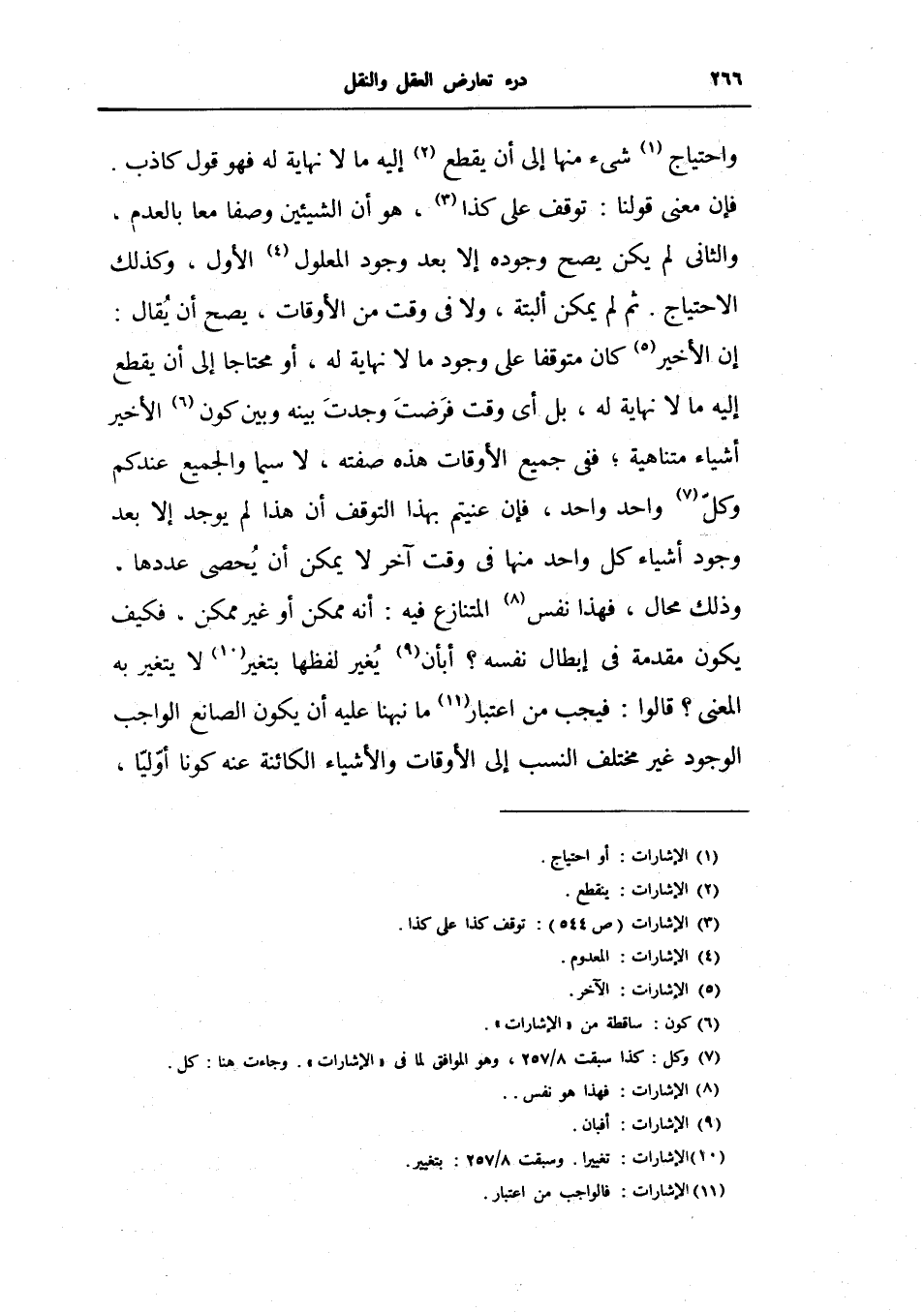 ثم لم يمكن البتة، ولا في وقت من الأوقات، يصح أن يقال: إن الأخير كان متوقفاً على وجود ما لا نهاية له، أو محتاجاً إلى أن يقطع إليه ما لا نهاية له، بل أي وقت فرضت وجدت بينه وبين كون الأخير أشياء متناهية، ففي جميع الأوقات هذه صفته، لا سيما والجميع عندكم وكل واحد واحد، فإن عنيتم بهذا التوقف أن هذا لم يوجد إلا بعد وجود أشياء كل واحد منها في وقت آخر لا يمكن أن يحصى عددها، وذلك محال، فهذا نفس المتنازع فيه، أنه ممكن أو غير ممكن، فكيف يكون مقدمة في إبطال نفسه؟ أبان يغير لفظها بتغير لا يتغير به المعنى؟ قالوا: فيجب من اعتبار ما نبهنا عليه أن يكون الصانع الواجب الوجود غير مختلف النسب إلى الأوقات والأشياء الكائنة عنه كوناً أولياً،