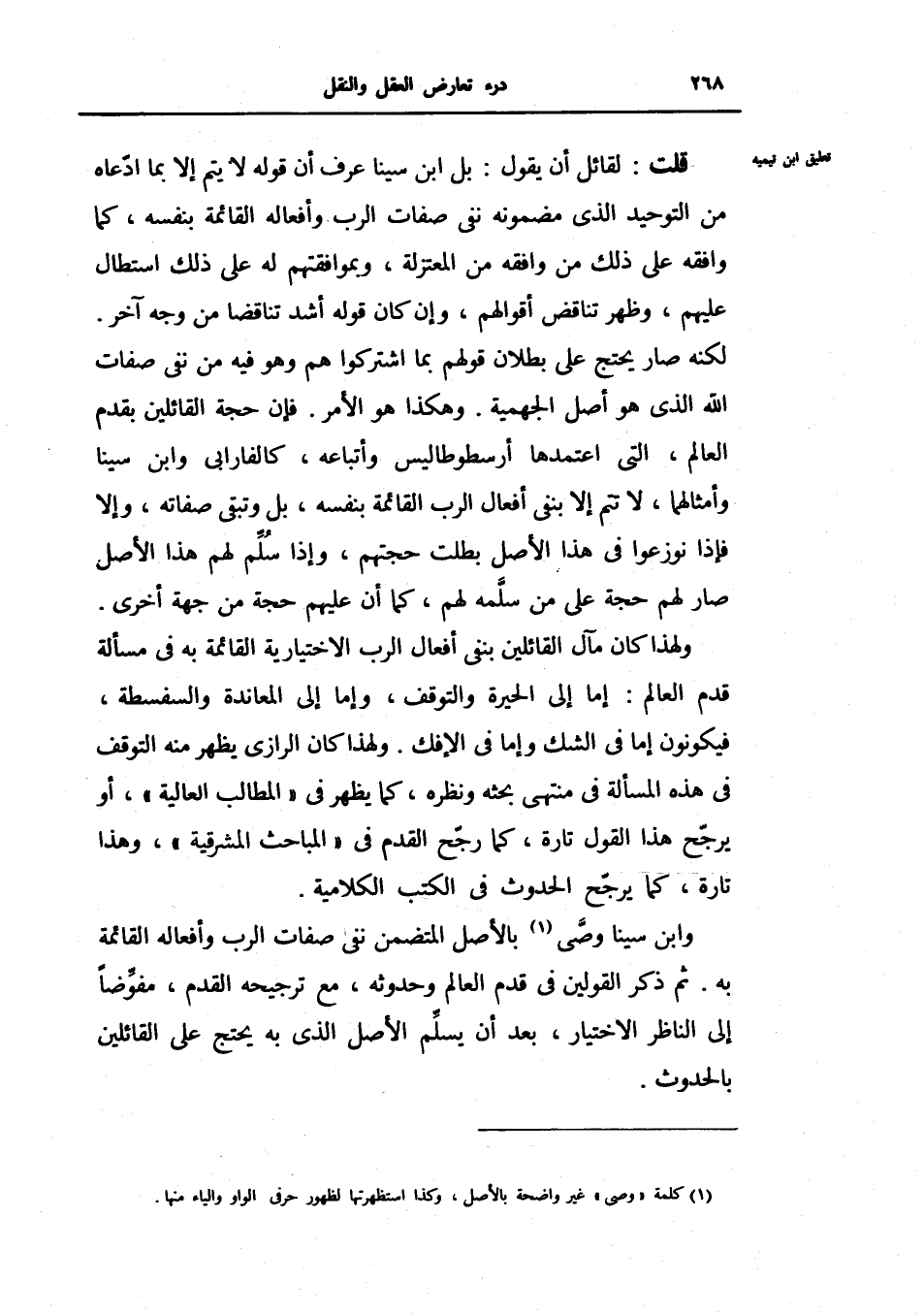 وابن سينا وصى بالأصل المتضمن نفي صفات الرب وأفعاله القائمة به.