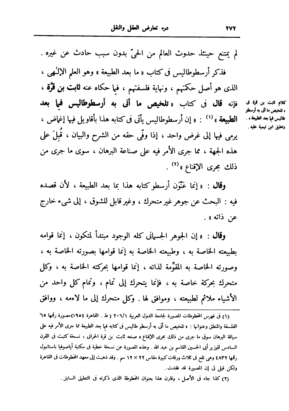 كلام ثابت بن قرة في تلخيص ما بعد الطبيعة وتعليق ابن تيمية عليه