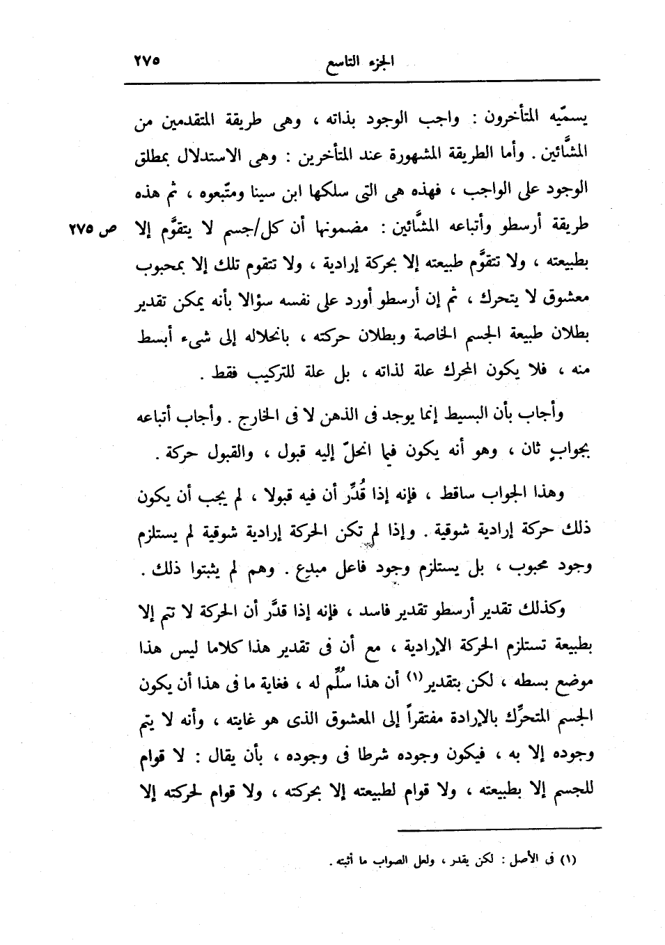 وكذلك تقدير أرسطو تقدير فاسد، فإنه إذا قدر أن الحركة لا تتم إلا بطبيعة تستلزم الحركة الإرادية، مع أن في تقدير هذا كلاماً ليس هذا موضع بسطه، لكن بتقدير أن هذا سلم له، فغاية ما في هذا أن يكون الجسم المتحرك بالإرادة مفتقراً إلى المعشوق الذي هو غايته وأنه لا يتم وجوده إلا به، فيكون وجوده شرطاً في وجوده، بأن يقال: لا قوام للجسم إلا بطبيعته، ولا قوام لطبيعته إلا بحركته، ولا قوام لحركته إلا