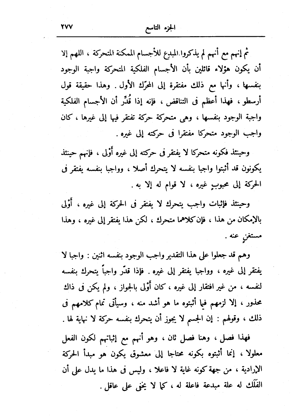 ثم إنهم مع أنهم لم يذكروا المبدع للأجسام الممكنة المتحركة، اللهم إلا أن يكون هؤلاء قائلين بأن الأجسام الفلكية المتحركة واجبة الوجود بنفسها، وأنها مع ذلك مفتقرة إلى المحرك الأول.