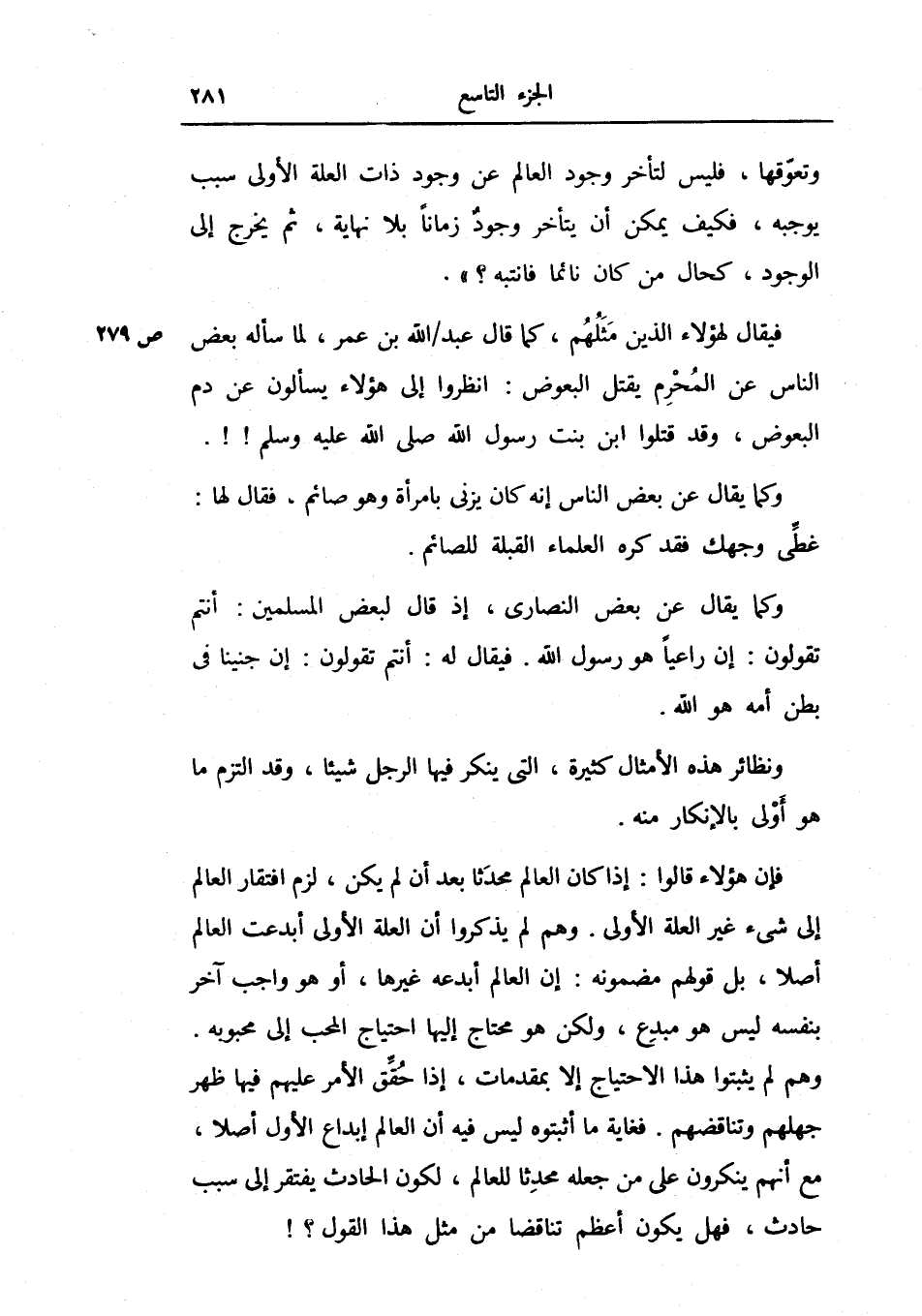 وتعوقها، فليس لتأخر وجود العالم عن وجود ذات العلة الأولى سبب يوجبه، فكيف يمكن أن يتأخر وجود زماناً بلا نهاية، ثم يخرج إلى الوجود، كحال من كان نائماً فانتبه؟.