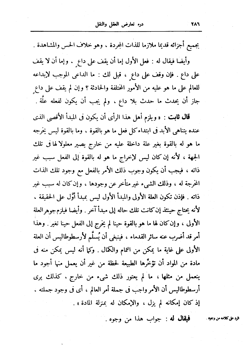 قال ثابت: ويلزم أهل هذا الرأي أن يكون في المبدأ الأقصى الذي عنده يتناهى الأبد في ابتداء كل فعل ما هو بالقوة، وما بالقوة ليس يخرجه ما هو له بالقوة بغير علة داخلة عليه من خارج يصير معلولاً لها في تلك الجهة، لأنه إن كان ليس لإخراج ما هو له بالقوة إلى الفعل سبب غير ذاته، فيجب أن يكون وجوب ذلك الأمر بالفعل مع وجود تلك الذات المخرجة له، وذلك الشيء غير متأخر عن وجودها، وإن كان له سبب غير ذاته، فإذن تكون العلة الأولى والمبدأ الأول ليس بمبدأ أول على الحقيقة، لأنه يحتاج حينئذ إن كانت تلك حاله إلى مبدأ آخر.