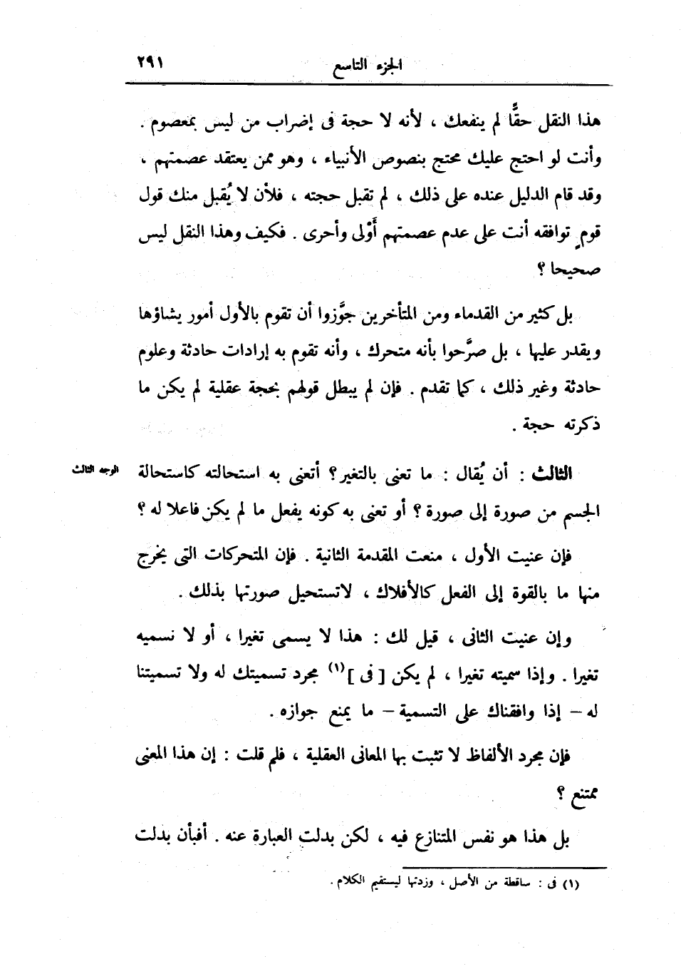 أن يقال: ما تعني بالتغير؟ أتعني به استحالته كاستحالة الجسم من صورة إلى صورة؟ أو تعني به كونه يفعل ما لم يكن فاعلاً له؟