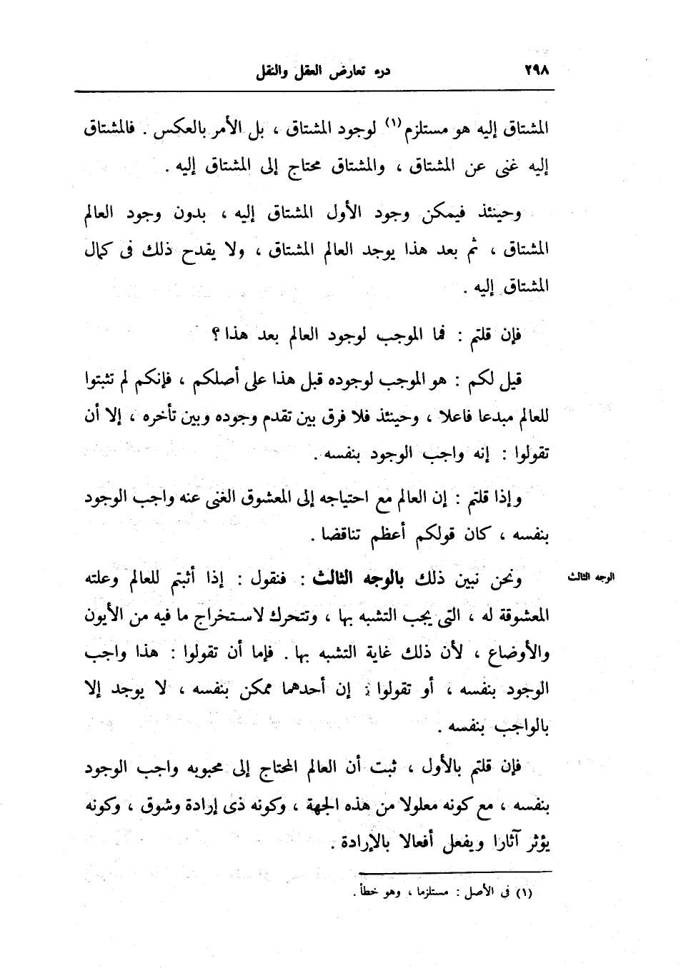 وحينئذ فيكم وجود الأول المشتاق إليه، بدون وجود العالم المشتاق، ثم بعد هذا يوجد العالم المشتاق، ولا يقدح ذلك في كمال المشتاق إليه.