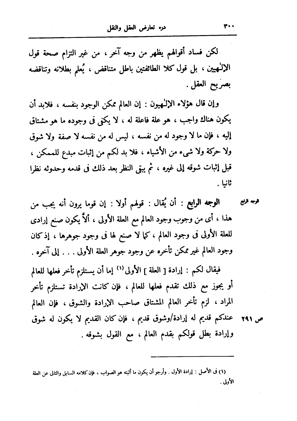 فيقال لكم: إرادة العلة الأولى إما أن يستلزم تأخر فعلها للعالم أو يجوز مع ذلك تقدم فعلها للعالم، فإن كانت الإرادة تستلزم تأخر المراد، لزم تأخر العالم المشتاق صاحب الإرادة والشوق، فإن العالم عندكم قديم له إرادة وشوق قديم، فإن كان القديم لا يكون له شوق وإرادة بطل قولكم بقدم العالم، مع القول بشوقه.