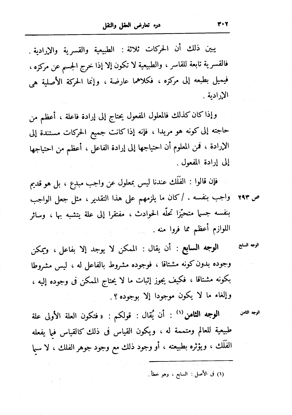 وإذا كان كذلك فالمعلول المفعول يحتاج إلى إرادة فاعلة، أعظم من حاجته إلى كونه هو مريداً، فإنه إذا كانت جميع الحركات مستندة إلى الإرادة، فمن المعلوم أن احتياجها إلى إرادة الفاعل، أعظم من احتياجها إلى إرادة المفعول.