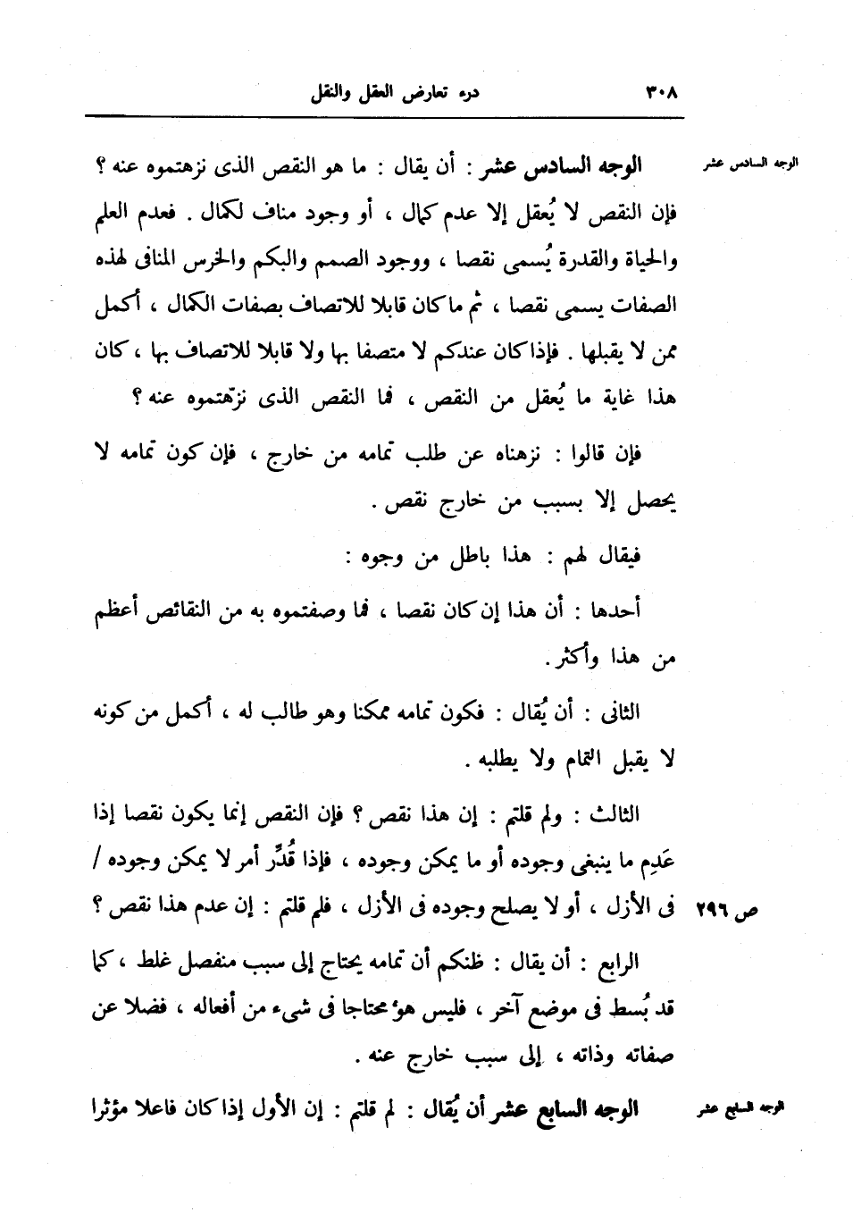 أن يقال: ما هو النقص الذي نزهتموه عنه؟ فإن النقص لا يعقل إلا عدم كمال، أو وجود مناف لكمال.